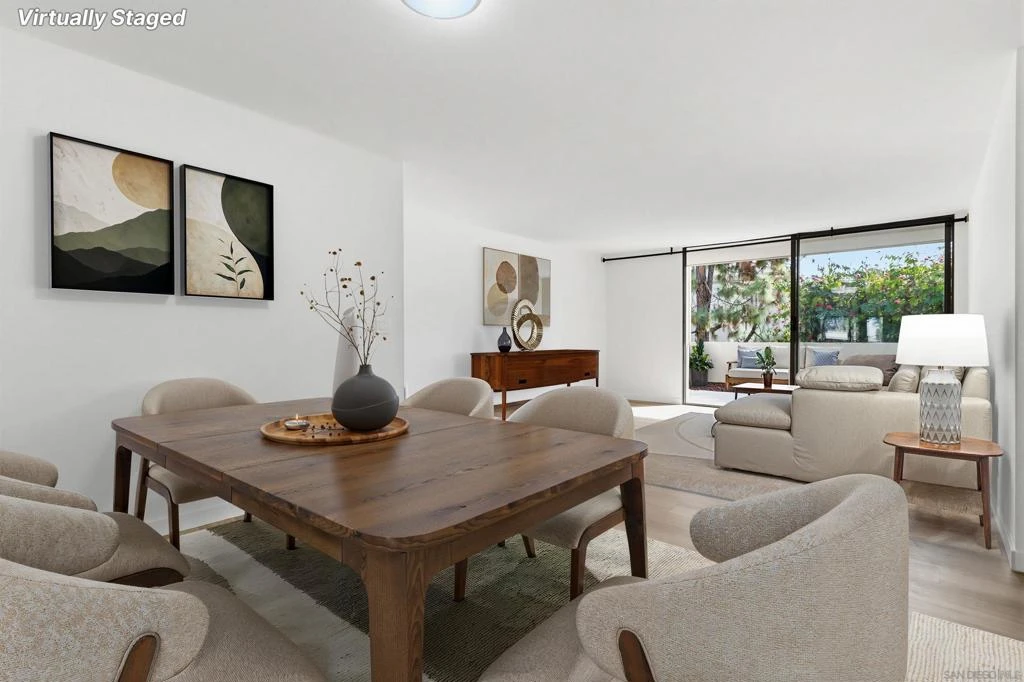 Living is easy with $313/month HOA dues, $215 less than nearby units! This remodeled condo has new appliances, flooring, kitchen & baths AND since it's getting hot out there, a brand new Mini Split AC. This single-level home is only 1 floor up with garage directly below and 2 private balconies. Overlooking the pool, the large main bedroom has 3 floor-to-ceiling, mirrored closet doors and an ensuite bath. And, it's the perfect location, with easy access to the 52, 805, 5, and all UTC restaurants & shops!