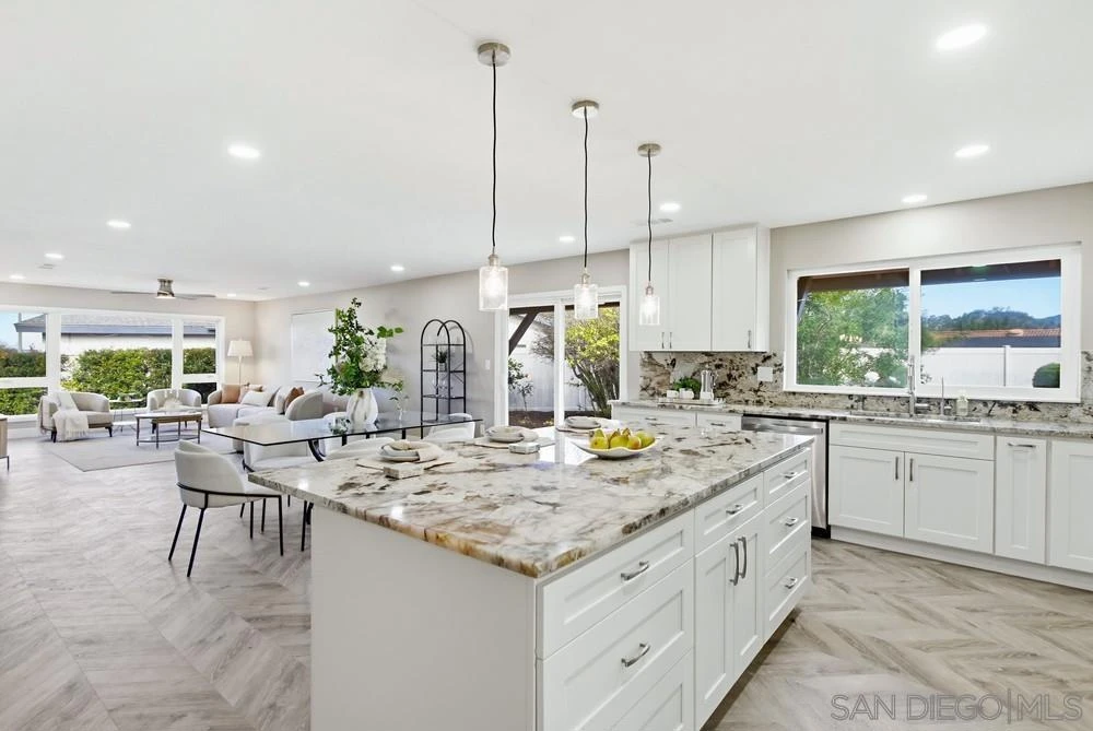 Set at the end of a quiet cul-de-sac on an expansive 17,000-square-foot lot, this fully renovated 4-bedroom, 3-bath residence offers approximately 2,700 square feet of thoughtfully modernized living space with major system upgrades already completed. The home features a re-imagined open floor plan that seamlessly connects the living and dining areas, complemented by brand-new vinyl plank flooring and fresh interior and exterior paint throughout. All kitchen and bath counter-tops are finished in premium Copenhagen granite sourced from Brazilian Exotic Granite, paired with entirely new cabinetry, fixtures, tubs, showers, and toilets. The kitchen is outfitted with a full suite of brand-new GE stainless steel appliances, including a French-door refrigerator, 5-burner electric range, microwave, dishwasher, under-sink reverse osmosis system, and InSinkErator disposal. Infrastructure improvements include a 200-amp electrical service and panel, a newly installed SDG&E gas meter, a Goodman 100,000 BTU furnace, and an Innovair 5-ton Slim24 air conditioning system, ensuring long-term efficiency and reliability. Outdoor and auxiliary spaces have been equally upgraded, with a new front concrete walkway, freshly painted covered patio floor, added insulation to the patio walls and ceiling, and new windows in the primary bedroom and patio area. The finished garage features drywalled and painted walls, an epoxy-coated floor, and a LiftMaster WiFi-enabled garage door opener. Landscaping is supported by an automatic irrigation system with Rain Bird valves and an Orbit 6-station controller. A