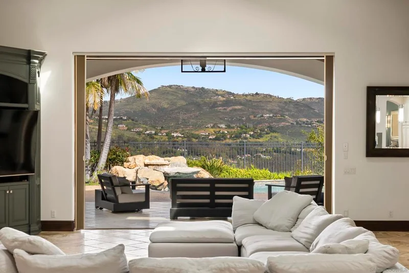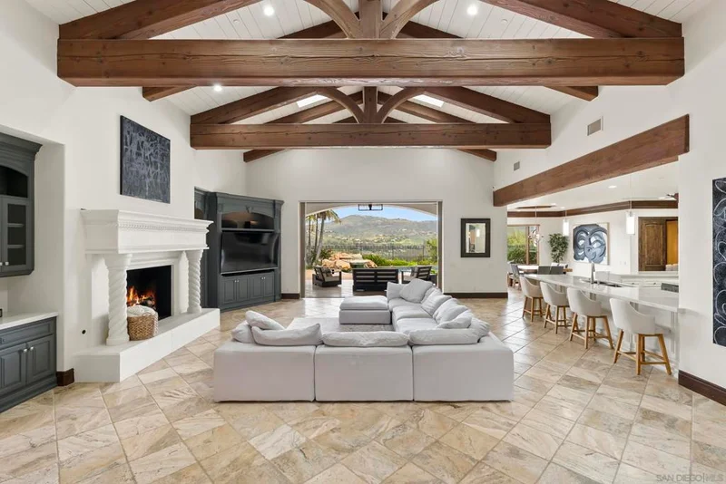 Stunning single-level home with spectacular panoramic views located in the guard gated community of The Crosby at Rancho Santa Fe. Spanning approximately 6,085 square feet, this custom-designed home features 4 bedrooms plus a dedicated office, soaring ceilings, and an abundance of natural light throughout. Upon entry, beautiful exposed wood beams immediately capture your attention, setting the tone for the home’s elegant design. The custom built-in office provides the perfect space for work or study. An expansive open-concept living room with fireplace flows seamlessly into the informal dining area and gourmet kitchen. The chef’s kitchen is outfitted with premium stainless-steel appliances, generous counter space, and a large island, making it ideal for both everyday living and entertaining. The home also features a private movie room for the ultimate entertainment experience. Each bedroom is ensuite, offering comfort and privacy. The spacious primary suite features soaring ceilings and a beautifully remodeled, light-filled bathroom complete with dual vanities, a large floating soaking tub, two water closets, and dual walk-in closets. Step outside to enjoy the expansive backyard with lush grass areas, a large pool and spa, and a fully equipped outdoor BBQ area—perfect for entertaining while taking in the amazing views. The family room opens to a covered outdoor living space with fireplace and seating, creating seamless indoor-outdoor living. Additional features include a 4-car garage and a prime location close to freeways, shopping, restaurants, and top-rated schools.