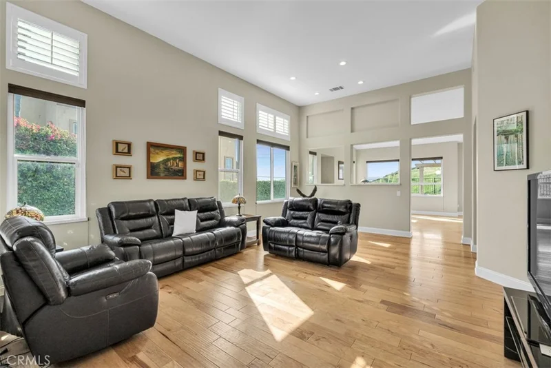 Nestled in the beautiful gated community of Bel Vintage in the highly desirable Via Verde Estates. This stunning single-story view home offers breathtaking city lights and rolling hills views. High ceilings throughout enhance the open and airy feel, complemented by rich wood flooring and custom quartz-inlaid windowsills that add a refined touch and adorn the newer installed windows. The thoughtfully designed kitchen features window coverings and seamless flow into the living spaces, perfect for everyday living and entertaining. The fourth bedroom has been expertly converted into a private office with built-in shelving, ideal for working from home. Step out front to view the beautiful paver driveway, elegant planters, and low-maintenance artificial turf. An oversized two-car garage with epoxy floors and custom storage cabinets completes this exceptional home, blending style, comfort, and functionality in a prime location.