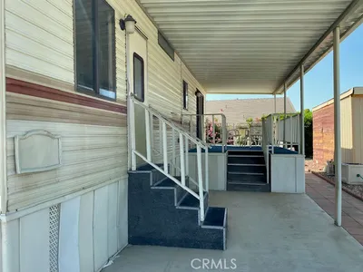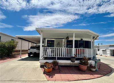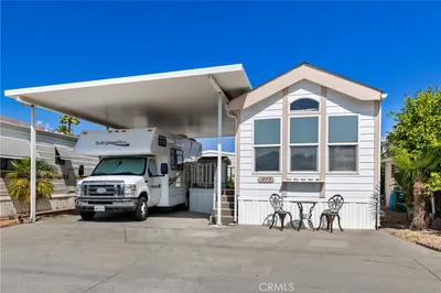 OWN YOUR LAND! Large “A” Lot in a Quiet Cul-de-Sac. Located in a desirable 55+ gated senior community, this well-maintained 1-bedroom, 1-bathroom home sits on a spacious lot and features a covered carport with an extended driveway that accommodates up to 3 cars. The main entrance is a beautiful French door installed only last year. Interior highlights include laminated vinyl flooring throughout, a bright living room with window coverings, and a functional kitchen with a 4-burner gas range, microwave, and refrigerator. Window AC on both the bedroom and the living room. The primary bedroom offers mirrored closet doors and direct access to the open patio. The bathroom includes a shower/tub combo, newer toilet, and additional storage cabinets. The backyard is lined with well-maintained bushes, providing privacy from the community walking trail. A storage shed with electrical (updated 2 years ago)offers space for hobbies, crafts, or a home office. Low HOA includes water, sewer, trash, basic cable, internet, and clubhouse amenities (pool, spa, BBQ area, kitchen/ banquet facilities, gym, library, and various recreational game rooms). Conveniently located near shopping, restaurants, medical facilities, and casinos. Incredible view of the San Jacinto mountains. This is extremely affordable retirement living!!