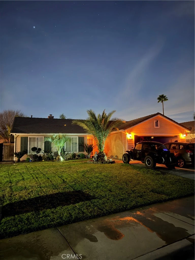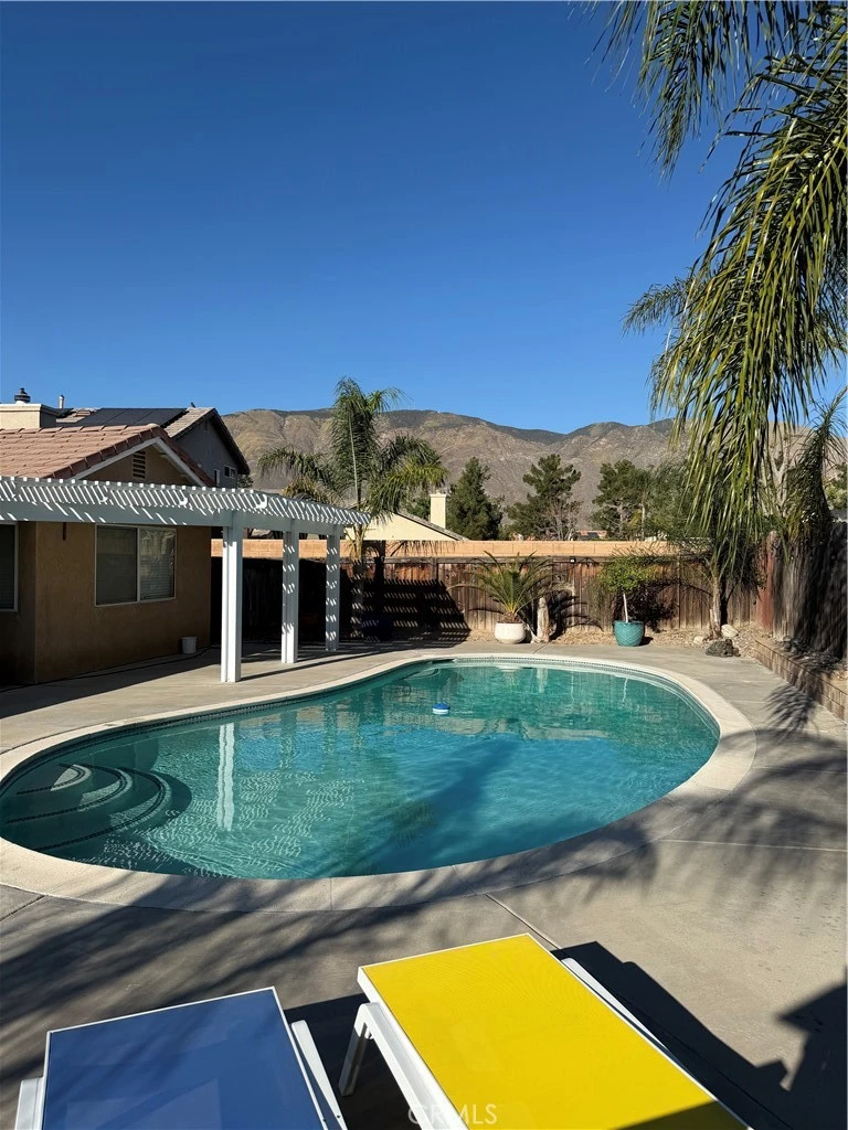 Step into this beautifully maintained single-story home, ideally situated in one of San Jacinto’s most desirable, established low-tax neighborhoods. Offering over 1,440 square feet of inviting living space, this residence features 3 bedrooms, 2 bathrooms, a family room, a formal living room, a separate dining area, and an attached oversized 2-car garage—complete with central air conditioning for year-round comfort. The entry welcomes you into a bright, thoughtfully designed open floor plan filled with natural light. The formal living room is a standout feature, complete with a cozy fireplace and picturesque views of your own private backyard oasis, highlighted by a stunning pool. The separate dining area flows seamlessly into the family room, which includes a ceiling fan for added comfort—perfect for both everyday living and entertaining. The kitchen is both functional and welcoming, featuring oak-colored cabinetry, tile countertops, a convenient breakfast bar, and an open connection to the family room. Each bedroom is equipped with a ceiling fan, while the oversized primary suite offers a relaxing retreat with a walk-in closet and private en-suite bathroom. Step outside and experience the true showstopper of this home—a beautifully designed backyard retreat. The custom covered and lattice patio creates an inviting space for outdoor dining, lounging, and entertaining, all while overlooking the sparkling pool. Surrounded by mature palm trees and enhanced with ambient lighting, the backyard offers a resort-like atmosphere that’s perfect for both relaxing evenings and lively gatherings. A newer pool pump adds peace of mind, while the fenced side yard—currently used as a dog run—provides additional versatility. Ample driveway and street parking complete the package. Conveniently located near schools, parks, churches, shopping, and entertainment, this home also provides easy access to Temecula wine country, scenic desert destinations, nearby lakes, recreational areas, and Southern California’s beautiful beaches. Don’t miss the opportunity to own this exceptional home—schedule your private showing today and experience the perfect blend of comfort, style, and location.