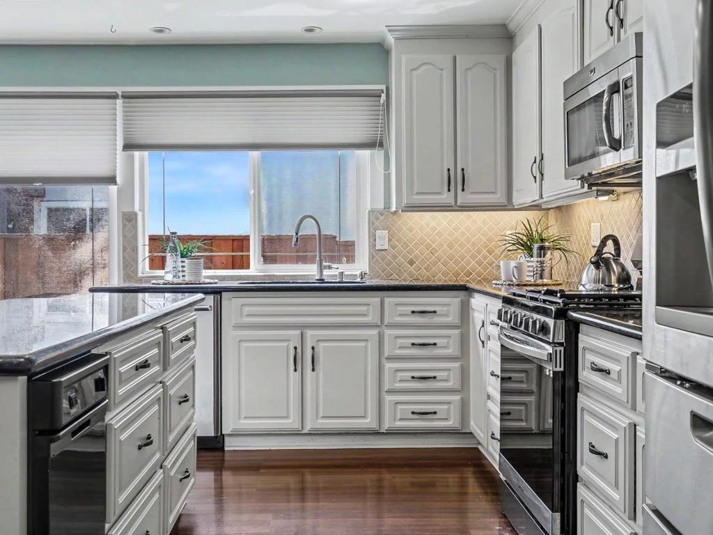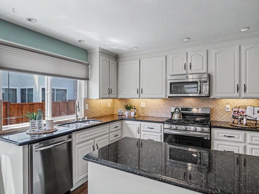 Beautifully updated home on a quiet San Jose court offering 4 bedrooms plus a 5th flexible den. The main-level primary suite features oversized walk-in closets with custom cabinetry, built-in desk, ironing board cabinet, and a remodeled bath with jetted tub, stall shower, and dual sinks. The remodeled kitchen includes granite countertops, stainless steel appliances, gas range, and custom cabinetry with pull-out organizers, plus a butlers pantry with sink. Enjoy laminate flooring, custom molding, built-ins, dual-pane windows, and fully paid solar. Lots of extra storage space in the accessible attic. Low-maintenance backyard with deck, artificial lawn, built-in BBQ center, and fire pit. Small yearly HOA is for the community Cabana pool. You will want to see this home in person before it's gone.