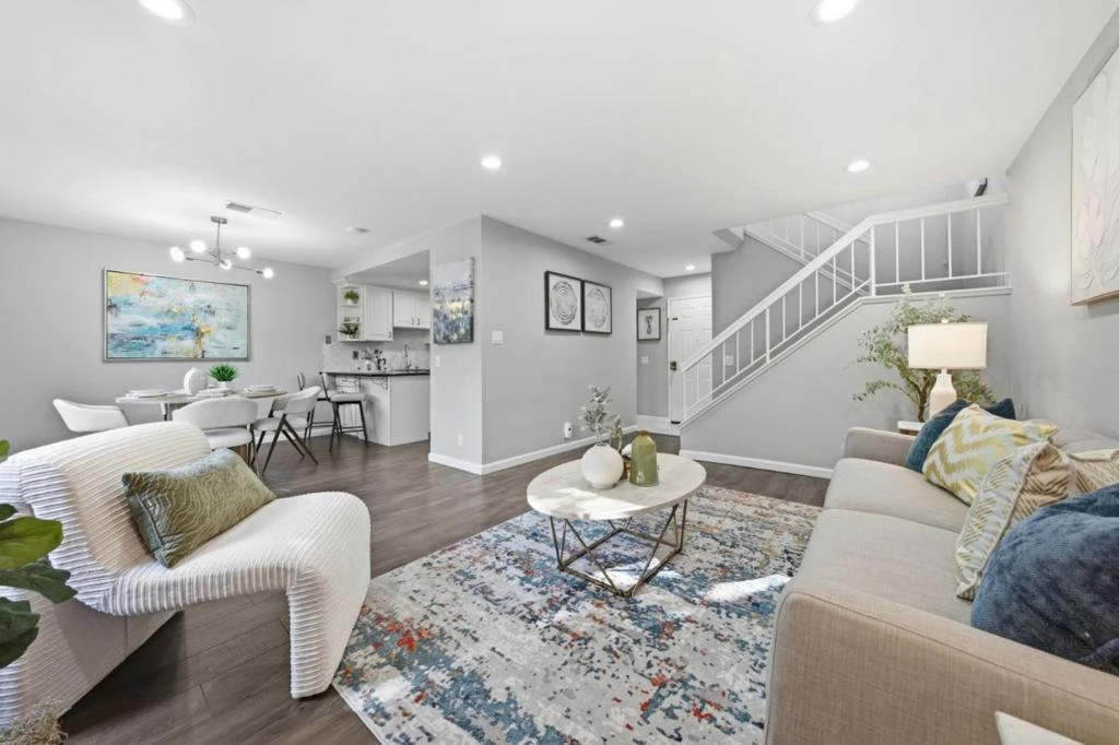 Nestled along nature with mature trees, this exquisite, bright townhouse is situated in the tranquil Deer Run II community. It features an open, sunlit layout with a desirable spacious kitchen and two bedrooms, each complemented by its own private bathroom. The living room includes a mosaic-tiled fireplace, and the dining area is generously sized. The remarkable kitchen boasts sleek stainless steel appliances, granite countertops, a spacious breakfast bar, and premium cabinetry/backsplash. The main bedroom retreat is especially luxurious, featuring a vaulted ceiling and walk-in closet. Additional amenities include recessed lighting, dual pane windows, central AC/heating, indoor laundry, a new double-strapped water heater, a new MyQ app-compatible garage door opener, a 220 Plug available for EV charging, and a fully finished two-car garage. The home offers a large private patio with easy maintenance artificial turf and access to a community pool and common areas. It is conveniently located near tennis courts, Edenvale Gardens Regional Parks, and Hayes Mansion. Open-house Saturday & Sunday, 1-4PM.
