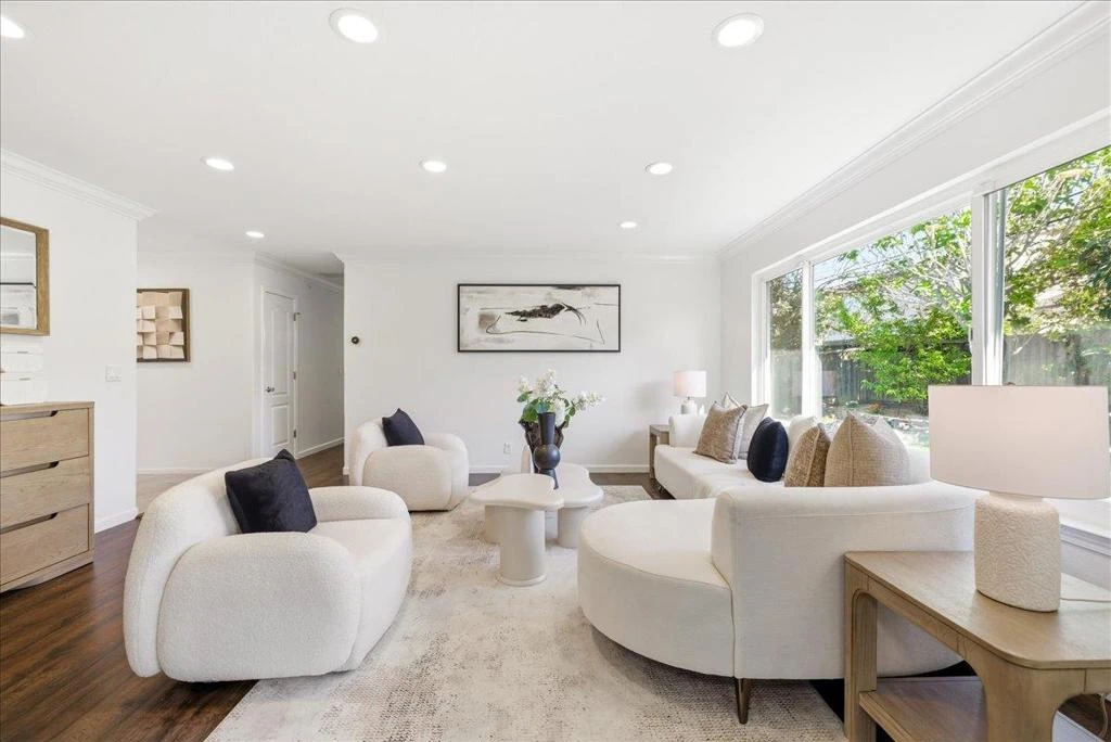 Beautifully updated single-story home minutes from top rated Cupertino schools, Santana Row & Apple Campus featuring a bright, light-filled interior & functional layout with luxury vinyl and tile flooring. Spacious living & family room with fireplace, built-in white cabinetry, recessed ceiling lighting, and large picture window. A sliding glass door provides seamless indoor-outdoor flow. Formal dining area enhanced by skylights with integrated track lighting. Bright galley-style eat-in kitchen showcases white shaker-style cabinetry, full tile backsplash, window above sink, and stainless steel appliances including refrigerator, cooktop, hood, built-in Bosch wall oven, & dishwasher. Spacious bedrooms offer built-in closets. Primary bathroom features a freestanding soaking tub, frameless glass shower enclosure with dual shower heads (rain + handheld), built-in recessed shower niches, linear drain, vanity, & consistent designer tile work. Additional highlights include a dedicated laundry area & thoughtfully designed living spaces throughout. Fenced backyard with lush lawn, concrete patio, raised planter area, & mature greenery, perfect for entertaining or relaxation. Low-maintenance landscaping & attached 2-car garage complete this move-in ready home.