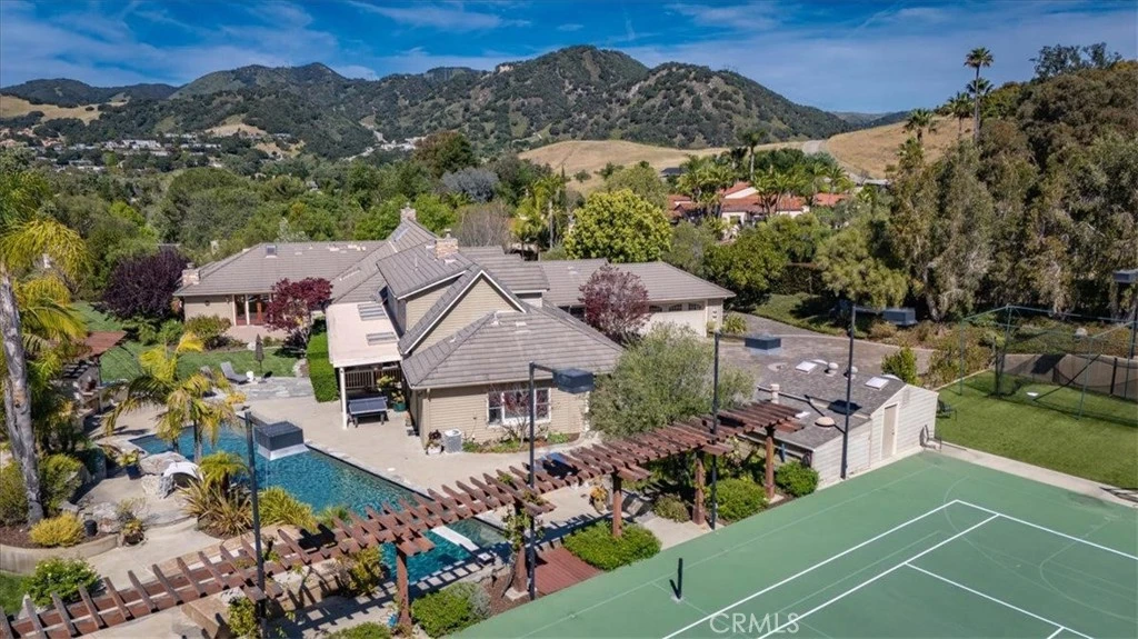 Hidden behind mature greenery and set well back from the road, this exceptional estate offers a rare blend of privacy, scale, and resort-inspired living in the coveted coastal enclave of Avila Beach. Encompassing approximately 7,000+ square feet of interior exterior living space - including decks and the workout room, the residence reflects a refined yet relaxed architectural style, thoughtfully designed for both everyday comfort and elevated entertaining. Sunlight pours through expansive windows and skylights, illuminating interiors that showcase soaring wood-beamed ceilings and rich hardwood floors. The home offers seven bedrooms and five bathrooms, including a convenient main-level suite and a private secondary living space complete with its own entrance, living area, and kitchen—ideal for guests, extended family, or flexible use. At the heart of the home, the kitchen combines warmth and function with quality appliances, generous prep space, and a natural gathering flow into the breakfast and family rooms. These spaces open directly to a covered, heated outdoor deck—perfect for year-round dining and effortless access to the pool and grounds. The primary suite serves as a peaceful retreat, featuring its own fireplace, built-in seating, and serene garden views. A spa-like bathroom includes a soaking tub positioned to overlook the landscape, a large walk-in shower, and thoughtful design elements that elevate daily living. Outside, the property transforms into a private resort. A large pool and spa with cascading water features create a relaxing centerpiece, while stone pathways wind through beautifully landscaped gardens filled with intimate seating areas. Recreational amenities abound, including a full-size tennis court currently adapted for pickleball, a separate sports court, and a basketball area. Sitting behind the improved backyard is a large grassy knoll up the hill with spectacular views, primed for a multitude of options. An expansive outdoor entertaining space is equipped with a built-in kitchen, BBQ, pizza oven, and warming features—ideal for hosting gatherings in a truly unforgettable setting. Additional features include multizone radiant floor heating, high end HVAC system, multiple water heaters, a whole house water filtration system, surround sound speakers, a large movie projector with screen, dual electric meters, and a commercial-grade gas line—ensuring both comfort and efficiency.