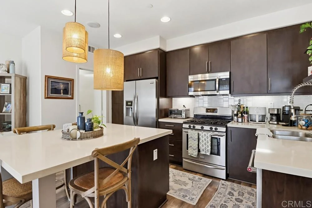 Nicely upgraded 2 bedroom condo in Solaire complex. Professional window coverings with black out shades in both bedrooms. Built in wire ceiling racks for overhead storage in 2 car garage plus extra storage area. Recessed lighting throughout the house with dimmers. Stacked washer /dryer in unit Ceiling fans in both bedrooms and family room. The gourmet kitchen offers a center island, granite countertops and stainless steel appliances. Tiled backsplash above kitchen sink with decorative shelves. Luxury vinyl wood-look flooring throughout living areas. Community amenities include a swimming pool, spa, and an outdoor barbecue area. Current tenant will be vacating late June. Unit will be available July 1st.