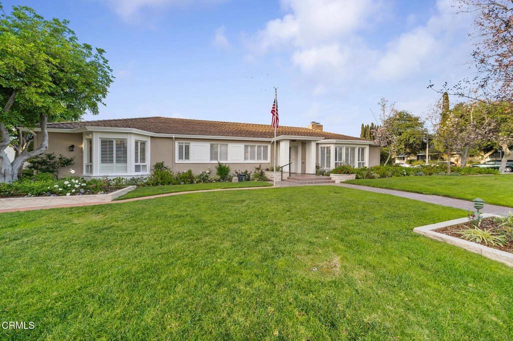 Offered for the first time in 60 years, this sprawling property is situated on a corner lot on a wide residential street. A sweeping front lawn with tiered brick steps leads to a welcoming front porch. The generous entry hall features newly refinished wood flooring throughout establishing a refined & cohesive aesthetic. To the right, the stately living room is filled with natural light from expansive bay windows with plantation shutters overlooking the front yard. A handsome stone fireplace anchor the space, making it well suited for both formal entertaining & everyday living. Double doors open to a library/office with built-in shelving & cabinetry, highlighted by two vintage illuminated stained-glass panels, a fireplace & a sliding door that leads to the side yard. Adjacent to the library is a step-down bedroom with double closets & two walls of picturesque windows of the garden. Adjoining the bedroom, a sunroom filled with natural light from skylights & large sliding doors on 2 sides. Complete with a fireplace & wet bar, this space offers a comfortable setting for casual dining or relaxed conversation while enjoying views of the backyard. Connecting the sunroom & the grand living room is the formal dining area, accented by a sleek chandelier and complementary wall sconces. Nearby, the efficient kitchen is designed with abundant cabinetry & overlooks the rear covered outdoor area. A pass-through window above the sink provides convenient access for serving food & beverages to the covered patio. The adjacent laundry/mudroom includes a utility sink, storage closets, & direct access to the covered patio. Off the long hallway, sunlit with skylights, is the second bedroom with built-in shelving, along with a hallway bath featuring double sinks & a shower-over-tub. This bath connects to an additional wing with a large Jacuzzi tub & sliding door access to the patio. The primary suite offers two bathrooms: one three-quarter bath with mirrored closets & a second full bath with a walk-in closet. The fourth bedroom features a built-in desk & a spacious closet with mirrored doors, as well as a sliding glass door to the back porch with easy access to the driveway. Completing this expansive property are a potting and storage shed, a three-car garage with an attached workshop, & a backyard accented by a small pond, flowering plants, & citrus trees. This well-loved home presents a wonderful opportunity for its next owner to personalize & enjoy for many years to come!!!