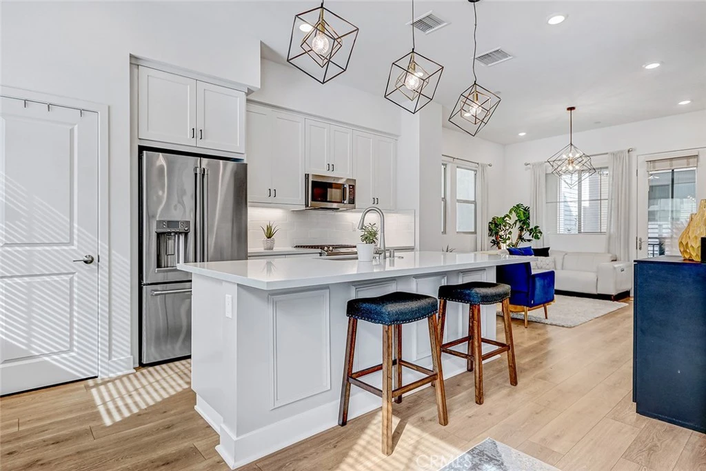 Like-new and built in 2023, this stunning tri-level single-family home is located in the highly desirable Harbor Pointe / Ponte Vista planned community in San Pedro. Designed with both style and functionality in mind, the home features designer finishes throughout and access to resort-style amenities including a pool, recreation center, fitness room, parks, BBQ areas, fire pit, and scenic walking trails. Enter through a charming white picket-fenced patio into a versatile first-floor flex space—ideal for a home office, gym, or bonus room—with direct access to the attached two-car garage and additional storage. The bright and open second level is the heart of the home, boasting high ceilings and a spacious chef’s kitchen centered around a large quartz island, perfect for entertaining. The kitchen flows seamlessly into the family room with access to a private outdoor deck, as well as a dedicated dining area, convenient powder room, and a tucked-away laundry closet. The third level offers a serene primary suite with a generous bedroom and walk-in closet, along with two additional bedrooms and a full bathroom. Enjoy low HOA dues and an unbeatable location close to beaches, shopping, dining, and major freeway access. This is modern coastal living at its best—move-in ready and not to be missed.