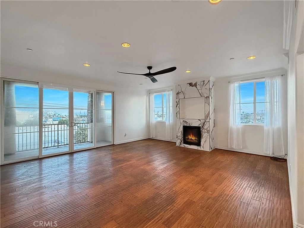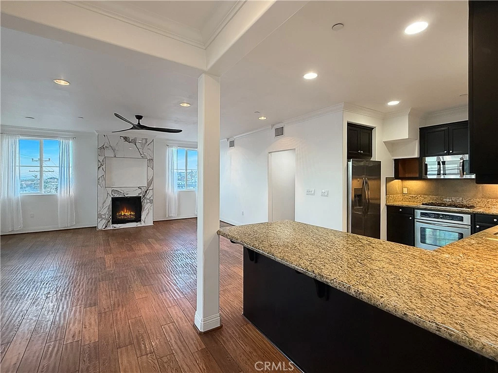 HERE'S THE TROPHY OF THE NEIGHBORHOOD: BEST BUY FOR A 2 BEDROOM 2 BATH CONDO IN SAN PEDRO, 2 SIDE BY SIDE GARAGE SPACES AND NO LAND LEASE! This Condo is Perched on the Top Floor and it features show-stopping coastal ocean views, elevated finishes, and a lifestyle that feels straight out of a luxury magazine. Spanning approximately 1,090 sq ft, this freshly painted 2-bedroom, 2-bath condominium is drenched in natural light and finished with rich wood and Italian tile floors, recessed lighting, and a striking Italian ceramic tile fireplace. Step through the sliding glass doors onto your private balcony and take in calming views. The kitchen commands attention with granite counters and backsplash, stainless steel appliances, gas stove, and custom wood cabinetry, while both bathrooms feature tile flooring, granite finishes, and glass-enclosed tiled tubs. The primary suite impresses with a walk-in closet and built-ins. Complete with in-unit laundry, two side-by-side underground parking spaces, and a rooftop deck boasting panoramic views, workout space, and entertainment seating, this is not just a home - it’s the coastal upgrade you’ve been waiting for.
