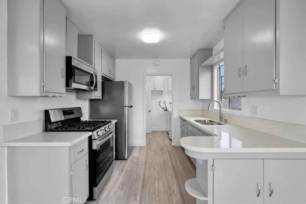 This upper-unit two-bedroom sits above the street tucked away on one of Vista Del Oro's slower residential blocks. From this vantage point, a metal screen door allows for the ocean breezes to enter throughout the day. A wall of living room windows captures natural light and looks out over the neighborhood. Inside, the unit is clean and consistent, showcasing recent updates. Light-toned LVP floors run throughout, the open living and dining area is airy and well-lit, and the kitchen is fully outfitted with contemporary gray cabinets, quartz counters, and a stainless appliance package including a gas range, built-in microwave, and full-size refrigerator. The dedicated laundry room just off the kitchen houses a full-size washer and dryer, already in place, which is the kind of thing that sounds minor until you've lived without it. The laundry area functions as an extension of the kitchen with upper cabinets for added storage and space to add racks for pantry items. The updated bathroom features built-in pocket shelves in the tub enclosure, a substantial vanity cabinet with extra storage and is topped with a stone counter, plus there is a wall mounted over the toilet storage cabinet. Both bedrooms are comfortable and bright, each with large closets and deep overhead storage. One bedroom could make a great home office! One car garage parking included. Window A/C units are allowed. What makes this address work beyond the four walls is the neighborhood around it. Busy Bee Market, a corner-store favorite, is a few blocks away (their sandwiches have a reputation that extends well beyond the city!) Averill Park is a great place for a morning walk or a dog that needs room to roam. CRAFTED at the Port and Warehouse 9 Brewery with food trucks rotating in regularly is a nearby weekend hang. The West Harbor waterfront development is actively reshaping what coastal living looks like from this end of the South Bay, and it's getting better by the day!