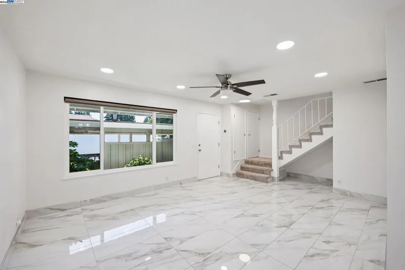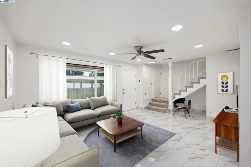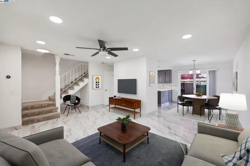 Motivated Seller!! Beautiful NORTHEAST facing townhome tucked at the end of a quiet court in the desirable Twin Creeks neighborhood! Recently updated with beautiful elegant oversized tile flooring & baseboards in the living room/dining room/kitchen. Large spacious light filled living room has new recessed lighting & ceiling fan. Updated modern kitchen with quartz countertops, full tile backsplash, gray cabinetry & stainless steel appliances, including refrigerator. Dining Room with plenty of space for entertaining opens to the private back patio with beautifully tiled patio, shade & storage. Guest bathroom is located off kitchen and laundry closet in kitchen with washer and dryer included has additional overhead storage cabinets. Spacious primary bedroom upstairs w/mirrored closet doors, new ceiling fan and large window overlooking backyard. Two additional bedrooms with mirrored closet doors and recently added overhead lights. Updated full bathroom with newer vanity, sink, light fixture & mirror. This move-in ready home also features Nest Smart Thermostat, Dual Pane Windows, 1 Assigned Carport Parking Space, Ample Guest Parking and Community HOA Pool. Located close to top-rated San Ramon Schools, parks, shopping, dining, City Center Bishop Ranch & Easy Freeway Access.