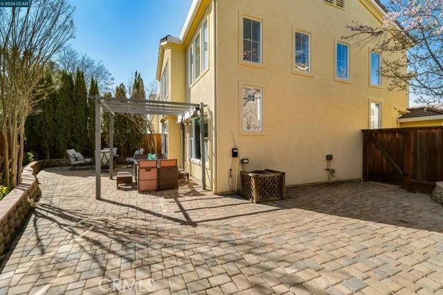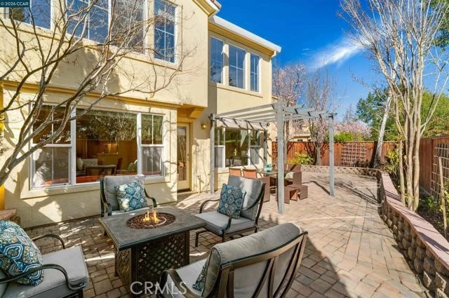 Nestled in the conveniently located and highly desirable Cedar Bridge community, this end-unit townhouse lives like a single-family home and is within walking distance of award-winning San Ramon schools, including Coyote Creek Elementary. The home is situated on a premium lot with inviting private rear and side yards that back to open space, offering no rear neighbors. The extended driveway provides additional parking alongside the attached two-car garage, and ample guest parking is just a few steps away. High ceilings in the entryway and living room create a welcoming first impression. The living room features a gas fireplace, a half bath, and an array of windows that provide an abundance of natural light. The remodeled kitchen showcases white cabinetry, solid stone countertops, a subway tile backsplash, a walk-in pantry, counter seating, and high-end LG stainless steel appliances, including a gas range. The dining area includes a built-in bench with storage and direct access to the relaxing backyard. The bathrooms feature white cabinetry, solid stone countertops, and tile flooring. Gleaming hardwood floors run throughout the home, and the bedrooms include custom closet organizers. The spacious yard boasts upgraded landscaping and pavers, perfect for outdoor enjoyment. Community amenities include a pool, front landscaping, and exterior maintenance. The home is conveniently located near parks, trails, and the City Center.