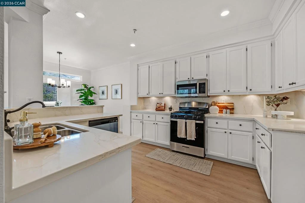 Move-in ready condo in desirable San Ramon, ideally located near top-rated schools and scenic walking trails. This spacious end-unit home offers 3 bedrooms, 3 full bathrooms, plus a versatile bonus room, all within a bright, open-concept layout designed for modern living.The interior features new laminate flooring throughout, fresh interior paint, and abundant natural light. The kitchen is beautifully updated with freshly painted cabinetry, new quartz countertops, and a gas stove, flowing seamlessly into the dining area and family room—perfect for both entertaining and everyday living.All three bedrooms and two full bathrooms are privately situated on the second floor, with updated bathrooms featuring new cultured marble countertops. Additional highlights include interior access to a two-car garage, a dedicated laundry room with hookups, and the privacy of an end-unit location with no neighbors above or below. Enjoy outdoor relaxation on the private patio.A wonderful opportunity in a prime location, near city center mall—don’t miss it.