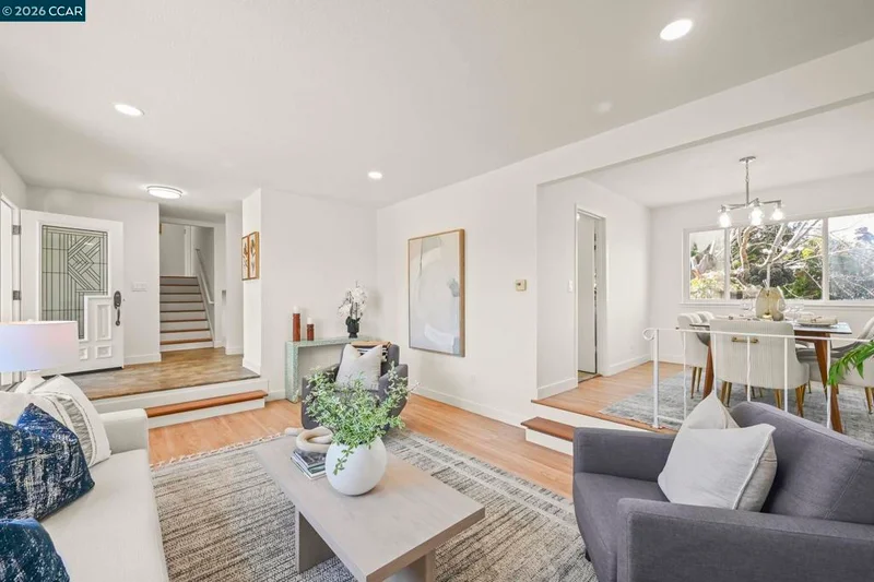 Light, bright, and beautifully expanded, this 4-bedroom, 3-bath home is perfectly situated in a desirable San Ramon location. Gorgeous hardwood floors and recessed lighting enhance the main level. Downstairs features a spacious living room, formal dining room, and an updated kitchen with stainless steel appliances and granite countertops overlooking the back deck. Downstairs, enjoy an oversized family room complete with a cozy pellet stove and built-in bookshelves. This level also includes a bedroom and a full bathroom with a shower stall - ideal for guests or a home office. Upstairs, you’ll find two spacious, light-filled bedrooms, an updated hall bath, and an oversized primary suite featuring a sitting room with a charming fireplace.The rear yard is designed for relaxation and entertaining, offering an elevated deck and a luxurious spa beneath a covered pavilion. Conveniently located just minutes from top-rated schools, parks, City Center Bishop Ranch, and Bishop Ranch, with easy freeway access - this is truly a home not to miss.