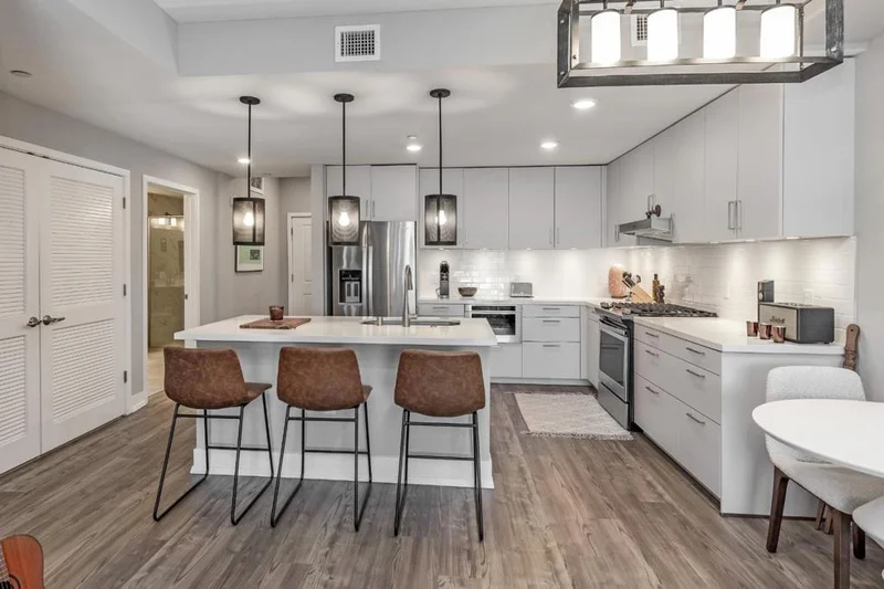Welcome to 1048 Monroe #207! This beautifully designed 2019-built condo is in a prime, walkable Silicon Valley location. Ideally situated just minutes from Nvidia, Apple, Google, and Meta, and within walking distance to Santa Clara University and the Santa Clara Farmers Market. Santana Row and Westfield Valley Fair are both less than a 10 minute drive. This 1-bedroom condo features an open-concept layout with beautiful flooring and abundant natural light. The modern kitchen is equipped with a large island, stainless steel appliances, and ample storage, making it perfect for both daily living and entertaining. Additional highlights include a dedicated office nook, coat closet, and an oversized walk-in laundry room with a full-size Whirlpool washer and dryer. The spacious bathroom offers dual vanities and a large walk-in shower. Residents enjoy access to a fitness center, secured ButterflyMX entry, a secure mailroom, and two designated tandem underground parking spaces. Located on the second floor, the unit also provides direct access to a courtyard and BBQ area right outside your door. Don't miss this opportunity! This home comes partially furnished with a Rove Concepts couch, a dining table, bar stools, standing desk, and media stand for added convenience.