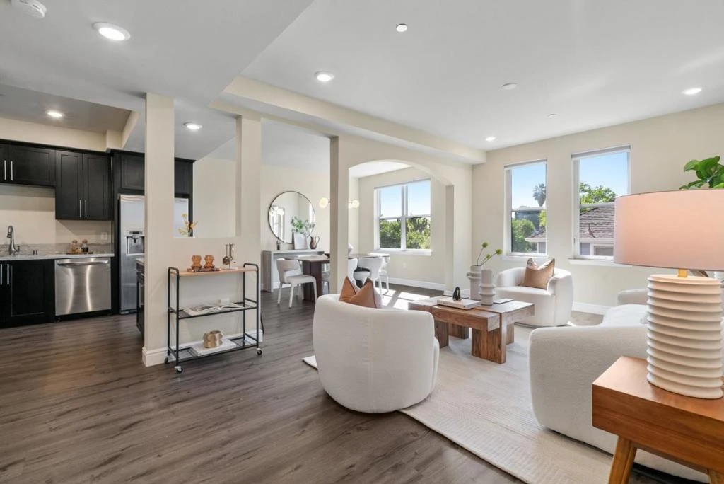 Rare opportunity to own a spacious corner unit that truly lives like a single-family home. This 4-bedroom, 3-bath layout offers great flexibility, including a desirable bedroom and full bath on the main level ideal for guests, extended family, or a home office. The bright, open living space is filled with natural light and enhanced by a quiet setting with no neighbors above or below. The kitchen features stone countertops, sleek cabinetry, stainless steel appliances, and a breakfast bar that flows seamlessly into the dining and living areas. Upstairs, you will find three additional bedrooms, all generously sized with great light and open views plus a huge walk-in closet. Nest thermostat for energy saving. Enjoy a secured building with amenities including a gym, clubhouse, and rooftop deck, plus two reserved garage parking spaces and additional 8x8x10 secured storage room. Prime Santa Clara location minutes to Nvidia, Apple, Santana Row, Google bus stop around corner, and walking distance to Santa Clara Town Center and Santa Clara University.