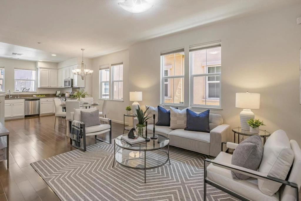 Welcome to your amazing dream home! This exceptional end-unit townhome is designed for comfort and convenience, featuring 3 generously sized bedrooms and 3.5 modern bathrooms. The main level offers a versatile bedroom, perfect for guests or a home office. On the third floor, discover two elegant ensuite bedrooms for ultimate privacy and the primary with a large soaking tub. The home is bathed in natural light with large windows, a spacious living area with beautiful engineered hardwood flooring and recessed lighting. The well-appointed kitchen includes an abundance of cabinetry, stainless-steel appliances, and a large pantry. The added benefit of a RO water filtration system and energy-efficient blinds, a Nest thermostat, ADT wiring and an attached side-by-side 2-car garage with cabinetry only add to the appeal of this home. Located in a vibrant community, you will be close to Levi Stadium, Agnews Historic Park, Santa Clara Square, Rivermark Plaza, the high-tech hubs of Silicon Valley. This move-in ready townhome combines modern amenities with a prime location-an incredible opportunity that you will not want to miss!