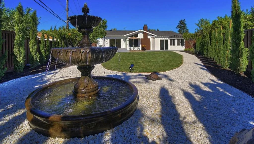 Expanded, vaulted, and thoughtfully updated, this approximately 1,785 sq ft home offers four spacious bedrooms and two beautifully remodeled designer bathrooms on an approximately 11,875 sq ft lot. Major system upgrades include updated HVAC with heating and air conditioning, plus an updated water heater. The refreshed kitchen features painted cabinetry, updated cooktop, updated refrigerator and dishwasher, and luxury vinyl flooring extending through the kitchen, dining area, bathrooms, and addition. Both bathrooms have been remodeled with cohesive designer finishes, including updated vanities, mirrors, lighting, plumbing fixtures, and upgraded shower features with exotic slabs in shower enclosures floor to ceiling. Interior improvements include whole-house paint, updated bedroom lighting, updated hardware, new baseboards, and refined trim detailing. The finished garage features drywall, fresh paint, and epoxy flooring. Outside, enjoy professionally maintained landscaping with extensive irrigation, a custom fountain, expansive driveway parking with room to turn around, mature fruit trees, and an evergreen privacy border. Convenient Santa Clara location near Millikin Elementary and major tech campuses including Apple, Nvidia, ServiceNow, Intel, AMD, and Palo Alto Networks.