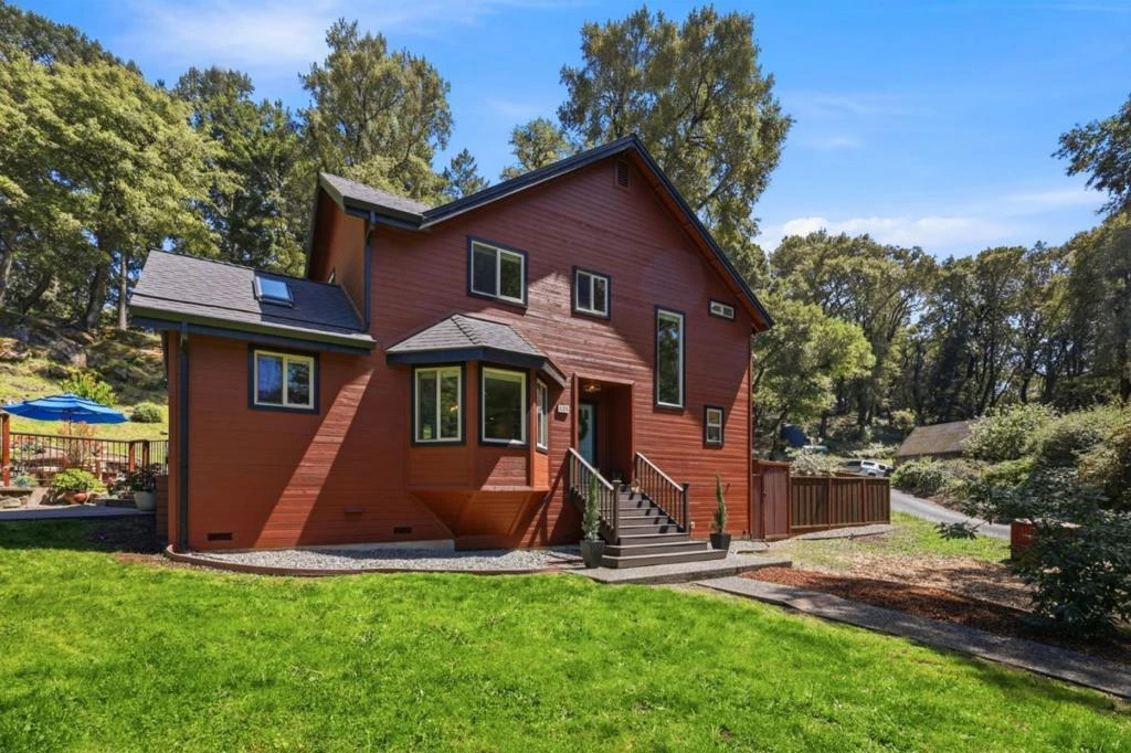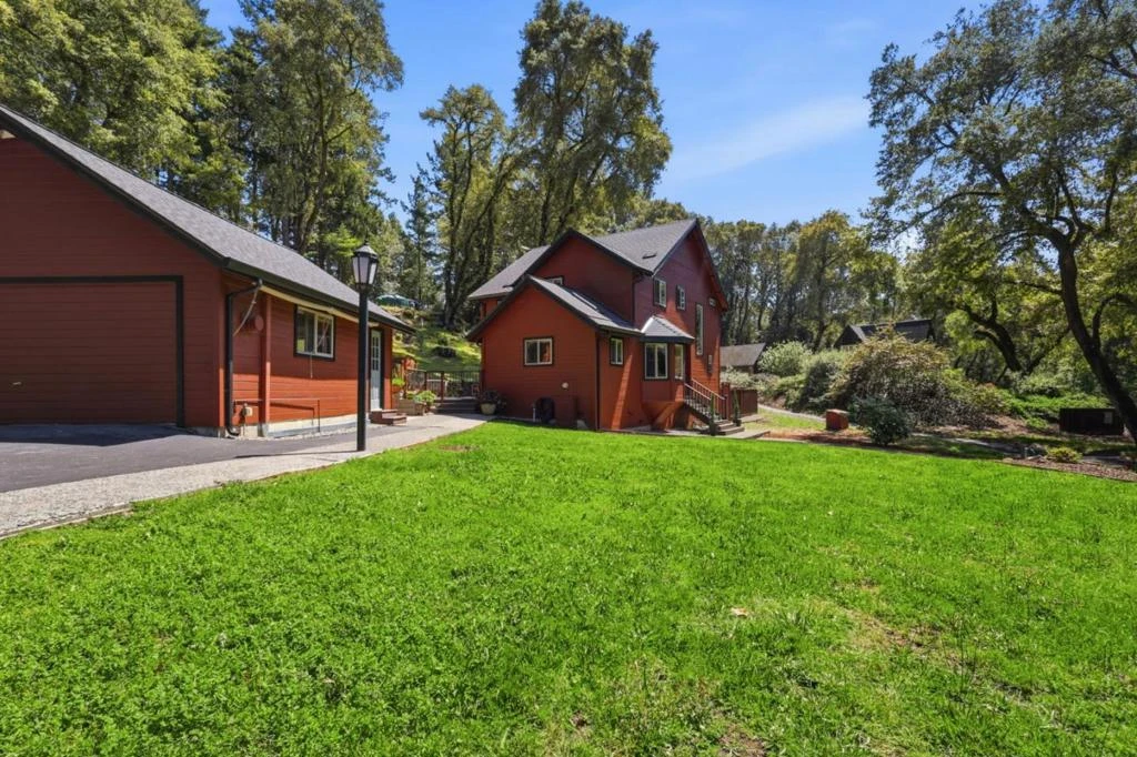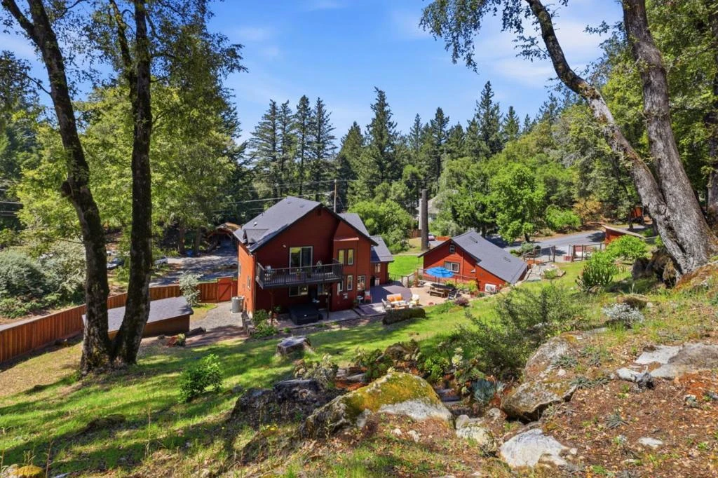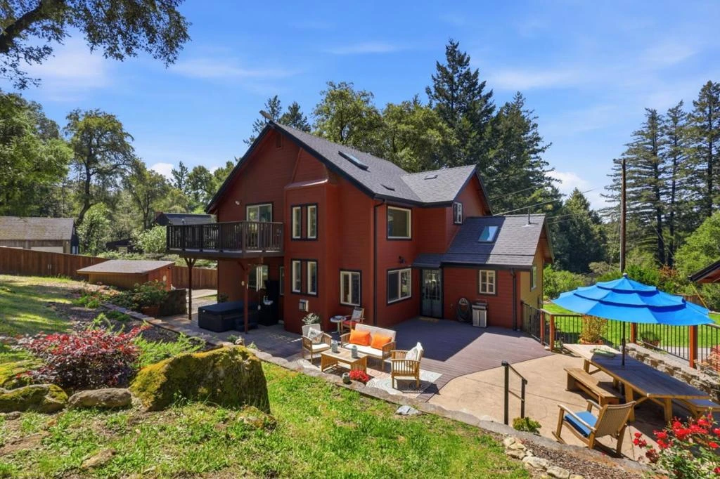 Enjoy contemporary comfort and serene mountain living in this inviting Bonny Doon home. The bright living room features soaring 20-ft ceilings, a striking fireplace, hardwood floors, and expansive windows that fill the space with natural light. The kitchen offers granite countertops, skylights, ample cabinetry, and stainless steel appliances, flowing into an elegant dining area with built-in seating and framed hardwood flooring. Indoor-outdoor living shines with a spacious deck and patio ideal for relaxing or entertaining. The primary suite includes a private balcony with wooded views and a decadent primary bath with a walk-in shower and a radiant headed tile floor. A converted garage provides a flexible 1BR/1BA guest space. Additional highlights include a renovated lower-level bathroom, therapy spa, and a fully fenced yard suitable for pets. Fire-hardened features and a Firewise community enhance safety. Conveniently located near Bonny Doon Elementary, beaches, wineries, and Hwy 1, with easy access to UCSC. Surrounded by natural beauty, this property offers a peaceful setting with space to garden, unwind, or enjoy outdoor activities, making it a versatile retreat for a variety of lifestyles.