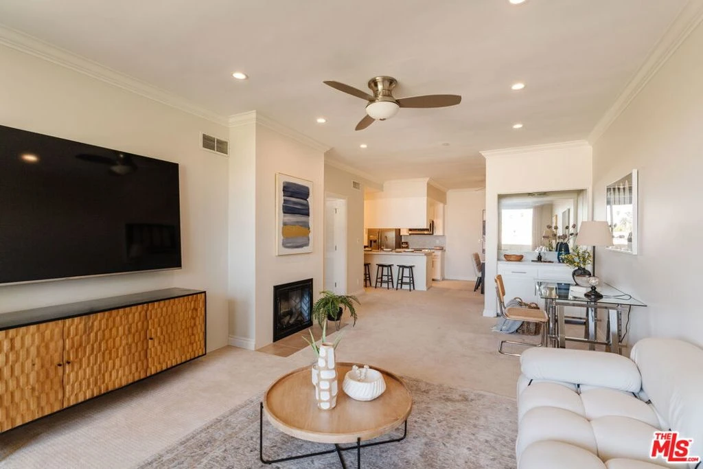 Incredible Santa Monica location just one block from the beach and moments to the shops + restaurants on popular Montana Ave. This renovated, top floor penthouse unit has it all. You're welcomed by a large, formal entry that flows into the updated kitchen showcasing beautiful Carrera marble countertops, stainless appliances, and ample cabinet space. The large dining area located just off the kitchen is perfect for entertaining and flows right into the oversized living room with adjacent dry bar. Just off the living room is a large, covered patio with tree top and mountain views in the distance. The spacious primary suite boasts a huge walk-in closet, bath with dual vanities + separate tub/shower, and large picture window. To top it off, the unit has laundry conveniently located in the hall off the bedroom. HOA dues include Earthquake Insurance and features an onsite exercise room. This unit has it all in a prime Santa Monica location to enjoy the SoCal lifestyle at its best!