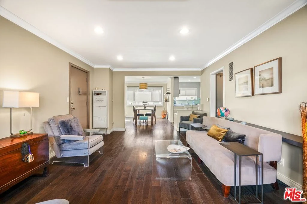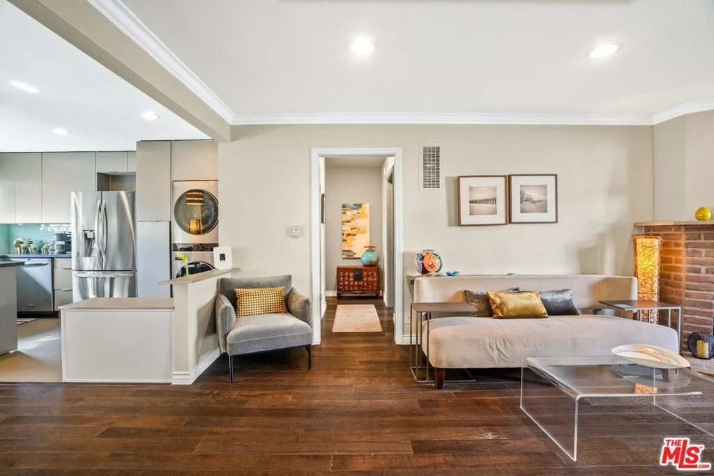 Metropolitan Urban Chic Oasis in Santa Monica! Exclusive controlled-access 14-unit courtyard enclave with lush landscaping. This top floor retreat with serene greenery views. Rich textured engineered wood floors across the entire unit with an expansive living room anchored by a classic brick gas fireplace. There is a seamless transition to the outdoors through elegant French doors to redone full balcony. Architectural depth is defined by elegant crown moldings and recessed lights in all rooms. Substantial full dining room that's capable of housing a full scale table, New grey wood sleek kitchen cabinetry and stainless steel appliances with quartz countertops with beautiful glass tile backsplashes and full granite sink. In-unit full size gas laundry provides ultimate in-home convenience and an updated dual- pane Milgard windows to optimize thermal insulation. Generously sized bedroom scaled to accommodate a dedicated workspace, Redone walk-in shower room with integrated bench seating and double vanity. Secured gated parking with storage and Low homeowners dues.Premier location that balances residential tranquility w/immediate urban access. Perfectly positioned near World-Class Medical hubs St. John's and UCLA. Short distance to UCLA campus and public transportation and Close to Bristol Farms, Whole Foods, Trader Joes and Erewhon