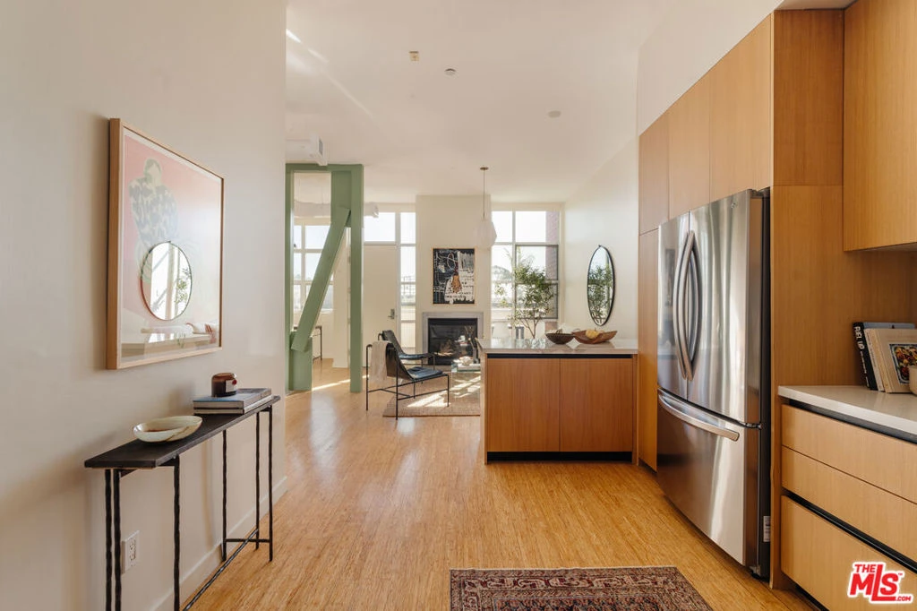Situated on the quiet, south-facing side of the Broadway Lofts, this second-floor studio offers a distinct blend of modern style and comfort. Unlike many other units in the building, this residence has been remodeled to create a warmer, cozier atmosphere while still maintaining its open loft appeal. 10-foot floor-to-ceiling windows line the south-facing walls, filling the space with natural light throughout the day. A standout feature is the oversized balcony, which provides a spacious outdoor area ideal for working from home or relaxing in the sun. The condo includes in-unit laundry, central air conditioning, and the rare benefit of secure, side-by-side parking for two vehicles, along with ample storage space and six guest parking spaces. Fresh air and sunlight flow throughout the common areas thanks to the open, architectural design. Building security is a priority, with key fob access required for common areas, elevators, and the garage. Residents also have access to a shared rooftop deck with city views. Conveniently located just blocks from Whole Foods, Trader Joe's, Co-Op Market, Ralph's, Tartine, Santa Monica Brew Works, Water Garden complex, parks, gyms, Expo-line, and only minutes from the 10 Freeway. A huge plus for cyclists is that Broadway has dedicated bike lanes to the Promenade and the Pier, ideal for enjoying beach living while leaving the car at home. HOA fees include earthquake insurance.