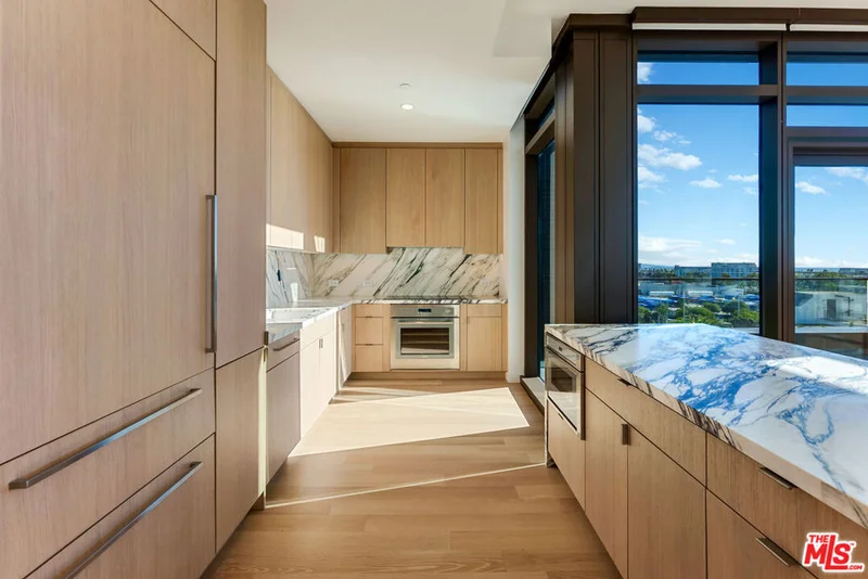 700 Broadway | Santa Monica's Most Glamorous Penthouse Collection | Penthouse 715 at 700 Broadway is a rare corner three-bedroom, two-bath residence offering refined luxury, architectural volume, and an expansive private terrace with partial Pacific Ocean views. Soaring 10-foot ceilings, wide-plank flooring, and dramatic floor-to-ceiling glass create a light-filled sanctuary with seamless indoor-outdoor flow. The chef's kitchen is a study in sophisticated design, appointed with Calacatta Monet marble countertops and full-height backsplash, custom oak cabinetry with integrated under-cabinet lighting, and a full suite of Thermador Smart Home appliances, including a wine refrigerator and microwave drawer. Spa-caliber bathrooms feature oak vanities, Cielo quartzite counters, Taj Mahal porcelain tile, and finely crafted Dornbracht fixtures, evoking a serene, resort-inspired atmosphere. Thoughtful upgrades include motorized roller shades, Nest thermostat, Lutron dimmable lighting, customizable Elfa closets, side-by-side LG washer and dryer, and secure keyless entry. Residents enjoy an unrivaled lifestyle with a 24/7 attended lobby boasting soaring double-height ceilings, on-site valet parking, and premier retail including Equinox Fitness Club and an upscale grocer. Amenities rival those of a private members' club, featuring a lush 3/4 acre landscaped park with fire pits and outdoor dining, co-working lounge and library, entertainment lounge with bar and demonstration kitchen, indoor-outdoor fitness pavilion, speakeasy lounge with poker room, bowling alley, private screening room, pet spa, and a resort-style pool deck with 75-foot lap pool, hot tub, cold plunge, barrel saunas, reservable outdoor entertaining suites, and a rooftop dog run.