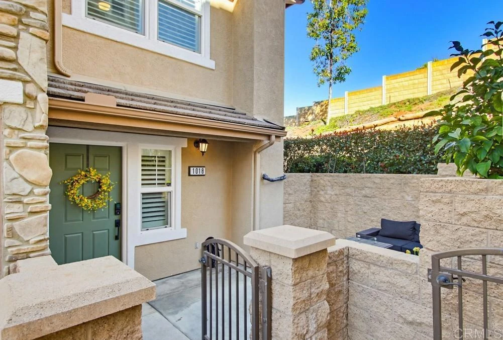 Nestled in the hills of Santee, this meticulously maintained, light and bright 3-bedroom, 3-bath plus office/optional 4th bedroom tri-level townhome offers 1,795 sq. ft. of stylish and functional living in the highly sought-after, gated community of Sky Ranch. This desirable end-unit features a spacious, enclosed entry courtyard, perfect for relaxing or entertaining, and leads into a versatile lower-level bonus room/office or optional bedroom with its own half bath. The main living level showcases an inviting open-concept layout highlighted by a generous family and dining area with recessed lighting and direct access to a private covered patio. The gourmet kitchen is beautifully appointed with granite countertops, white cabinetry, stainless steel appliances, gas cooktop, pantry closet, and abundant counter and storage space. A separate breakfast nook or workspace adds flexibility, while a full-size laundry room with upper cabinets completes the main floor. The primary suite offers peaceful valley and mountain views, dual connected walk-in closets, and a modern en-suite bath featuring dual sinks, extended counters, and contemporary fixtures. Additional bedrooms are well-sized and thoughtfully placed for privacy. Upgrades and features include: luxury vinyl plank flooring throughout the lower and main levels; carpet in bedrooms and upper hall/stair areas; dual-pane windows and plantation shutters throughout; central A/C and ceiling fans; tankless water heater; neutral gray paint with crisp white trim; attached oversized two-car garage, finished with custom SwissTrax flooring overlay. Residents of Sky Ranch enjoy resort-style amenities, including a sparkling pool and spa, playground, pet waste stations, and multiple built-in BBQ areas—all within a beautifully maintained gated community. Just minutes from shopping, dining, schools, lakes, and scenic hiking trails, this move-in-ready home offers comfort, convenience, and community all in one exceptional property.
