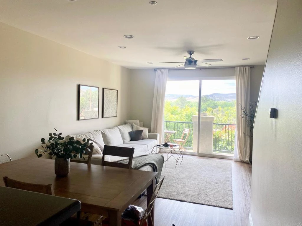 Welcoming and spacious townhome with no one above or below is warm and inviting with high ceilings, upgraded luxury vinyl planks, recessed lighting and fresh paint, this 3 bedroom and 3 bath home will accommodate most living situations with each room accessing a private bathroom. Stepping into the home with a large entrance and leading up the stairs to an open kitchen that overlooks the light and bright dining and living room or down a small hall into a guest bedroom and bathroom. The kitchen has lots of storage, a breakfast bar and includes refrigerator, stove, dishwasher and microwave. Off the living room is a balcony that overlooks open space with room for small table, chairs and BBQ. On the upper level are 2 bedrooms each with private bathrooms, and the main bedroom is extra large with his and hers closet. There is lots of storage throughout, ceiling fans in the bedrooms and living room and laundry room with washer and dryer. Completing the home is a 2 car tandem garage with built-in cabinets for storage. Located in the Treviso with community pool, spa and clubhouse. Easy access to the 52, Mission Hills Trails and much more.