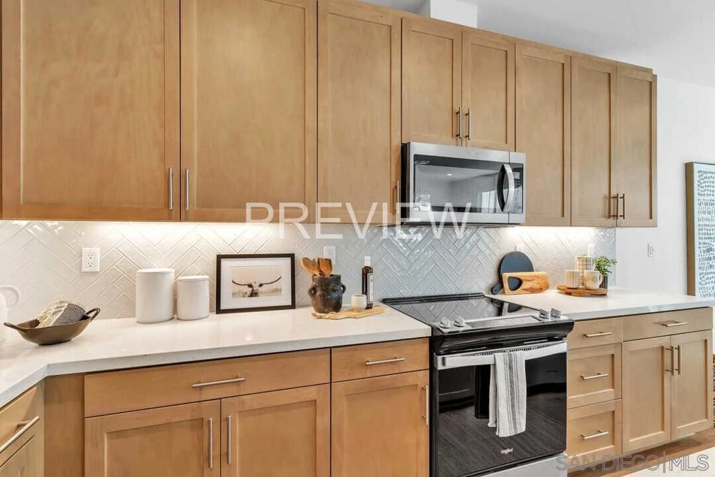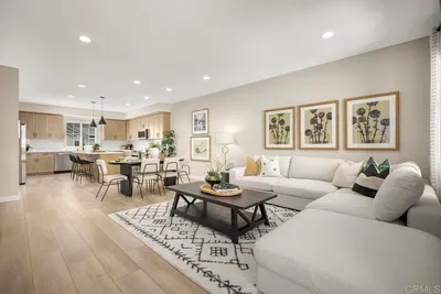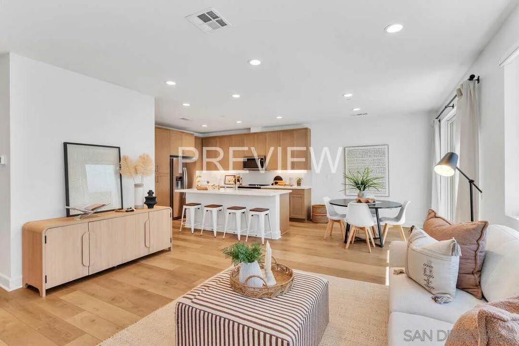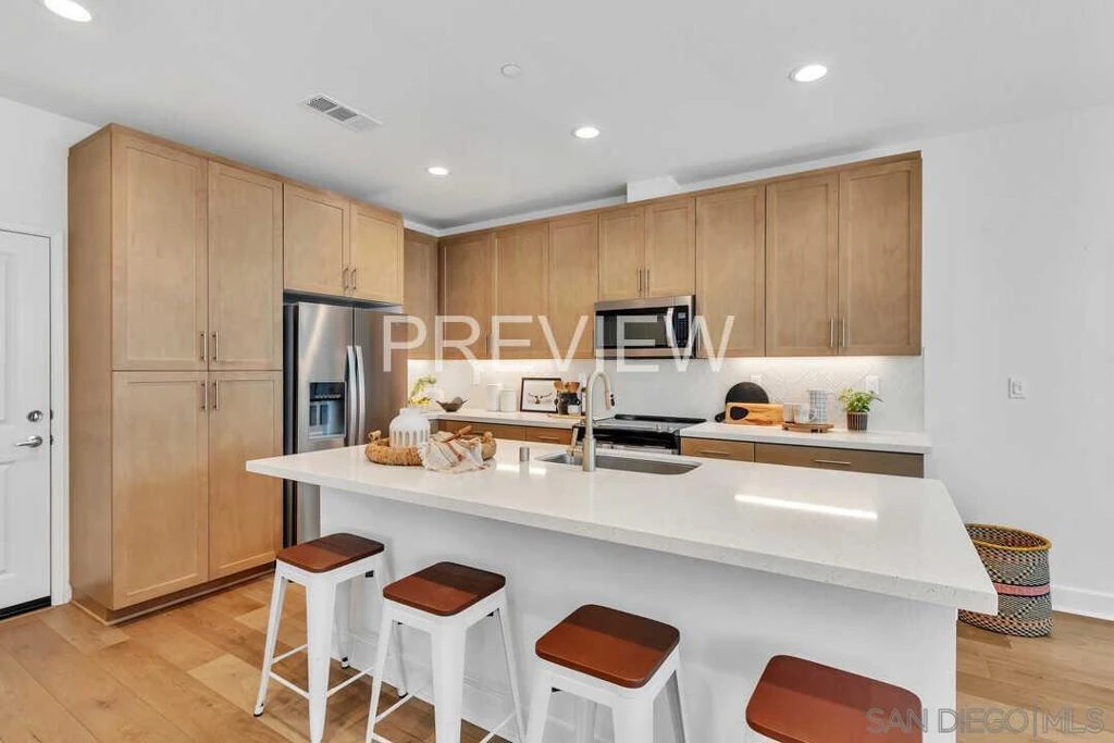 Built in 2023, this coastal cottage townhome is 3-bedroom, 2.5-bath home with a versatile loft offers 1,818 sq ft of modern living in a newer upscale all-electric community. The largest floor plans and a desirable corner unit, this home combines privacy, functionality, and thoughtful upgrades throughout. With completed landscaping, designer window treatments include motorized Hunter Douglas Vignette shades and custom white poly shutters add to the modern finishes. With these $45,000 builder upgrades in place, buyers can enjoy immediate move-in at ease. The open-concept main level is filled with natural light and showcases luxury vinyl plank flooring and designer touches throughout. The upgraded kitchen features full-height tile with a herringbone backsplash, maple shaker cabinetry creating a refined yet highly functional space ideal for everyday living and entertaining. Upstairs, the spacious primary suite offers a walk-in closet and a well-appointed bath with chrome hardware finishes. Two additional bedrooms, a full bath, an enhanced laundry area with added storage, and a generous loft provide flexible living space for a home office, media room, or play area. The staircase features modern square vertical balusters, adding to the home’s contemporary aesthetic. A convenient powder room and direct access to the 2-car garage with EV charger-ready wiring and epoxy flooring complete the first floor. Designed for energy-efficient living, the home includes owned solar, smart home technology features, and all-electric systems. The private backyard is fully landscaped and offers a comfortable space to relax or entertain. Residents enjoy resort-style amenities including a pool, spa, and play areas, all conveniently located near Mission Trails and Santee Lakes. Nearly new and thoughtfully upgraded, this home offers exceptional value, style, and convenience in today’s market.