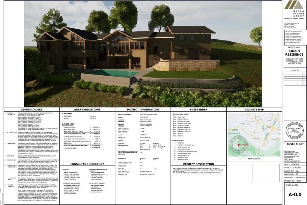 Architectural & Site approval should be complete by August 22 to 30th! Spectacular lot set along the ridge of Bohlman Road with incredible vistas of the valley and SF Bay. Architectural work through Tom Sloan of Metro Design Group, a highly respected and talented local architect. Stylish contemporary design with warm appointments. One has the benefit of a neighborhood feel with the privacy of mountain living provided by this wonderful setting and location. All the site engineering is complete including Geotechnical and Geological reports, a drilled well with water quantity and quality reports, Percolation test and report for Septic system, Survey and Topographical maps. Site, elevations and plan details for Architectural approval through the Planning department of County of Santa Clara available. Current home design for approximately 3,845 sf +/- in total not including Cabana and outdoor kitchen nor 605 sf +/- garage, set upon 13.28 net acres +/-. Saratoga Schools!