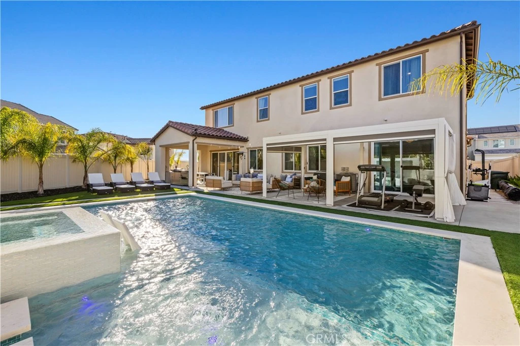 Come see this spectacular home and its incredible entertainer’s backyard. Perched in the scenic hills of Santa Clarita, just 35 miles north of Los Angeles, this spectacular 2022 residence delivers refined design, upscale finishes, and a lifestyle that feels straight out of a luxury design magazine. The open-concept floor plan showcases wide-plank flooring, a chef-inspired kitchen with premium appliances and quartz countertops, and seamless flow for effortless entertaining. The show-stopping backyard is a true private resort featuring dramatic fire and water elements, a stunning pool and spa, a California Room with BBQ, and multiple spaces to relax and host in style—plus additional room for a garden or potential ADU. Low solar lease. Located in a vibrant newer community with an upcoming elementary school (2028), scenic hiking trails, beautiful community centers, pools, pickleball, tennis and basketball courts, baseball fields, playgrounds, and dog parks, this home offers luxury living paired with an unbeatable lifestyle. Sophisticated, stylish, and truly unforgettable—this is Santa Clarita living at its finest.