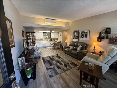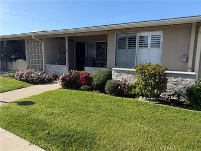 Terrific Location! This fabulous expanded one bedroom one-bathroom cottage is ready to move it. The unique leaded glass door enters into a living room that features plantation shutters, deluxe vinyl plank flooring, and a heat pump with air condition. The kitchen has white cabinets, built-in electric appliances including a stove top, oven, refrigerator, microwave, extra-large skylight, vinyl plank flooring, and a ceiling fan. The enlarged bedroom is spacious and features a walk-in closet that offers lots of storage, sliding glass doors with plantation shutters that open to the patio, a heat pump with air conditioning, plenty of space for an office area, and is carpeted. The bathroom has cultured marble vanity counters, cut-down shower, recessed lighting, a skylight, and vinyl plank flooring. The curb appeal is elegant with its stacked stone walls and charming private patio. It is conveniently located near downtown Leisure World. A great place to enjoy the many amenities offered and lovely ocean breezes.
