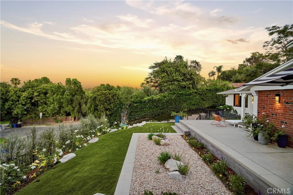 Set above the street behind a private drive, this reimagined Mid Century stunner in prime Sherman Oaks blends architectural pedigree with refined contemporary design. Originally built by renowned builder WM Mellenthin, the two bedroom, two bath residence spans approximately 1,500 square feet and has been extensively rebuilt with elevated finishes and seamless indoor outdoor flow. Taken down to the studs, the home features new plumbing, electrical, HVAC, air ducts, a tankless water heater, and an installed EV charger, offering modern efficiency and peace of mind. Open living spaces with soaring ceilings, Italian white oak flooring, and expansive windows and doors create an airy yet warm atmosphere filled with natural light. Designer lighting, smart home controls, and a striking double sided fireplace enhance the living areas. The kitchen is both sophisticated and functional, featuring premium appliances, sleek cabinetry, and thoughtfully curated finishes. Spa inspired bathrooms and custom details throughout further elevate the interiors, including custom closets, modern interior doors, and tailored window treatments. Sliding doors extend the interior to beautifully curated outdoor spaces. Newly designed landscaping, hillside improvements with drip irrigation, and front and rear landscape lighting create a private retreat framed by mature greenery. The nearly 9,000 square foot lot offers exceptional privacy along with treetop and valley outlooks, enhanced by a smooth plaster exterior and updated outdoor lighting. Located within the highly sought after Dixie Canyon Charter School District and just moments from Ventura Boulevard’s shopping and dining, this distinctive residence pairs Mid Century character with extensive designer upgrades and modern infrastructure, delivering effortless indoor outdoor living.