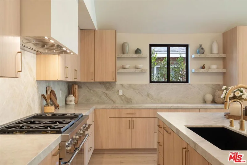 Fully remodeled, single-story Mediterranean Modern tucked in one of Sherman Oaks' most sought-after pockets of Chandler Estates! This 3 bedroom, 3.5 bathroom, single story home was taken down to the studs and completely reimagined with today's luxury buyer in mind. A number of major upgraded have been added to include new electrical, plumbing, drywall, HVAC, roofing, doors, windows and top of the line designer finishes throughout. The exterior showcases authentic Jerusalem stone, while inside features soaring vaulted ceilings, Burton Way hardwood floors, and oversized windows flood the open floor plan with natural light, creating an airy, open aesthetic. The chef's kitchen features Taj Mahal quartzite countertops, custom whitewashed Santa Barbara rift oak cabinetry with dark walnut accents in the primary suite, all crafted with Blum soft-close mechanisms, European hinges, and undercount tandem slides, with premium Thermador appliances. Each sizable bedroom includes its own ensuite bathroom, finished with travertine stone, Venetian plaster walls, and a standout green travertine powder room. Additional upgrades include side by side LG washer/dryer, Sonos surround system, Starlink WiFi built into the home, Amazon smart tablet control panel, Ring doorbell, EV charging capabilities and built-in cameras for modern convenience and peace of mind. The entertainer's backyard is your private oasis complete with an outdoor kitchen, wine fridge, built-in BBQ, and covered lounge surrounded by lush, low-maintenance landscaping. Turnkey, timeless, and truly one of a kind.