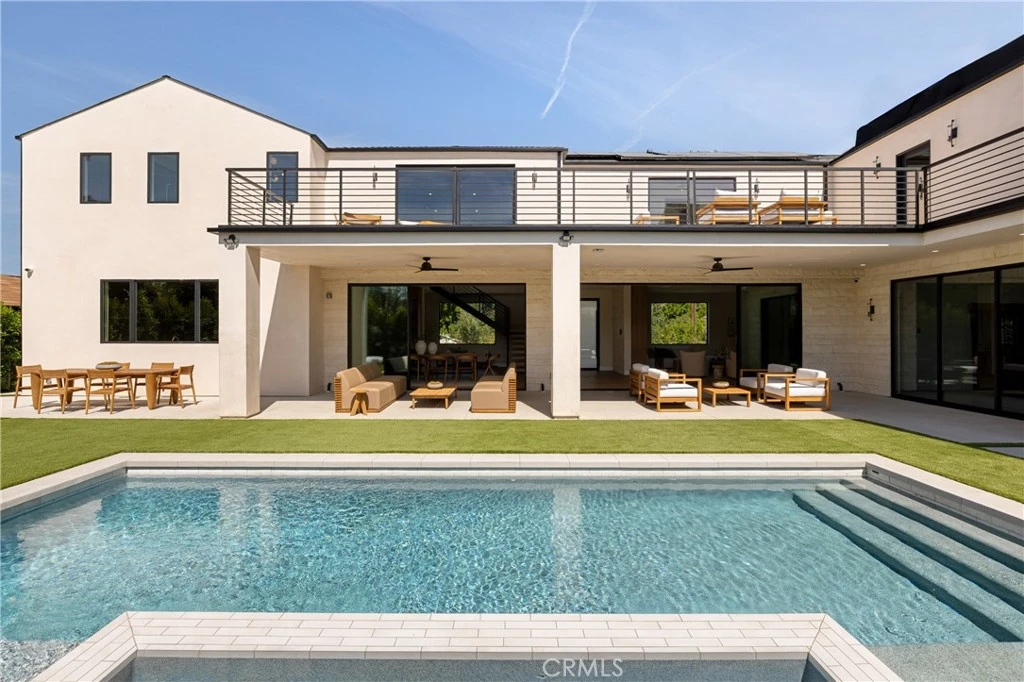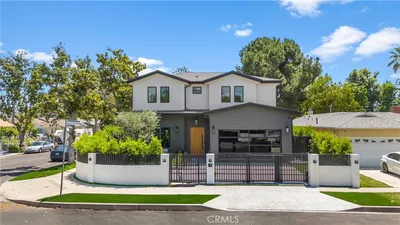 Situated behind private gates on a sprawling 9,000+ sq. ft. corner lot, this newly constructed architectural estate boasts an attached 1-bed, 1.5-bath ADU. Designed for modern living, the open-concept main level flows seamlessly from the spacious living and dining area into the gourmet chef’s kitchen, outfitted with professional-grade appliances, sleek custom cabinetry, a massive island and walk-in pantry. Two oversized sliding glass doors effortlessly extend the living space to the covered patio, creating a seamless indoor-outdoor living experience. The backyard is a true entertainer’s retreat, showcasing a resort-style pool and spa, fully equipped outdoor kitchen and privacy hedges that surround the property. Completing the main level is an ensuite bedroom and chic powder bathroom with a one-of-a-kind stone sink. On the upper level, you’ll find four generously sized ensuite bedrooms, a dedicated laundry room and spacious loft area that leads out to an expansive balcony. The luxurious primary suite features a custom walk-in closet and sumptuous ensuite with a soaking tub, large glass-enclosed shower and double vanity. The ADU offers exceptional versatility with its own private entrance, a living room, full kitchen, one bedroom and two bathrooms, perfect for guests, extended family or as additional living space. Further highlights include high ceilings throughout, a two-car garage and fully integrated smart home system that manages lighting, climate, audio and security. Ideally located within the top-rated Kester Avenue Elementary School District, just moments away from Ventura Boulevard’s premier shops and restaurants, as well as the Sherman Oaks Galleria.