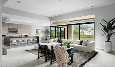 Welcome to 18510 Boulder Bluff — a breathtaking 5-bedroom, 4.5-bathroom home nestled in the exclusive, gated community of Saddle Crest in Silverado Canyon. Built in 2024, this expansive property offers 4,968 square feet of refined living space on an 18,336 sq ft lot, combining modern luxury with versatility, privacy, and unmatched canyon views. The main residence spans 4,199 sq ft on a single level, thoughtfully designed for open-concept living and effortless entertaining. The chef’s kitchen is a true showpiece, featuring elegant cabinetry, white quartzite countertops, a full-height backsplash, and a striking gray waterfall island. Outfitted with Sub-Zero and Wolf appliances, this kitchen is built to impress. The great room opens to the outdoors with cornerless stacking doors, framing sweeping canyon vistas and creating a seamless flow for indoor-outdoor living. The private guest casita, located above the garage with its own separate entrance, adds an additional 769 sq ft and includes a living room, bedroom, full bathroom, and a fully equipped kitchenette with a sink, microwave, dishwasher, and wine fridge. It’s the perfect setup for multi-generational living, extended guests, or a private home office retreat. The backyard offers a blank canvas with plenty of space to design your dream outdoor oasis—pool, patio, garden, or more—all while taking in the incredible natural surroundings. Additional features include plush carpeting throughout, designer lighting accents, and luxury finishes. Enjoy the peace and privacy of canyon living while being just minutes from the best of Orange County.
