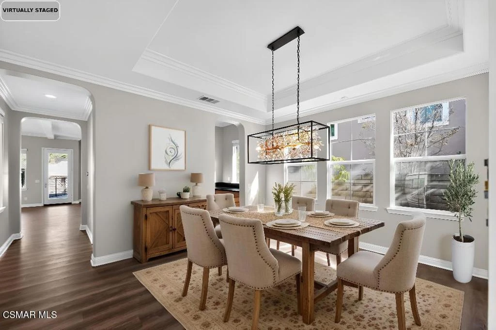 Welcome to this gorgeous and unique home in highly sought after Big Sky Community. This home has a spacious and well-appointed floor plan. The Foyer lends to a seamless flow into the updated family room with a fireplace. There is an open kitchen with quartz counter tops, a large center island, with sink and dishwasher. Kitchen is ideally located adjacent to the family room. Also, a Butler's pantry connecting to the formal dining area. Plenty of large windows allowing natural light and a view of the backyard. The home features a private courtyard with a fireplace. The main floor has one bedroom with a walk-in closet and ensuite bathroom. Second level is beautifully designed with a large primary bedroom with a fireplace, walk-in closet. Luxurious primary bathroom, featuring his & her vanity, stand-alone tub, spacious shower and sit in coiffeuse area. Large upstairs laundry room. Two of the bedrooms are Jack and Jill style, sharing one bathroom. The remaining bedroom also has an ensuite bathroom. Home has a beautiful entertainer's backyard! Nicely designed spa and pool, with water features and safety fencing which can be removed. Also Built in BBQ bar, features a pizza oven, kegerator, refrigerator, outdoor sink, with space for lots of seating. There is a dog run, and several fruit producing trees. Professionally landscaped with a firepit and an additional large patio deck area. Home also features solar with two Tesla power walls, and a tankless water heater. Home also has a Ring security system. Big Sky community offers a wealth of outdoor amenities, including walking and hiking trails, a dog park and breath-taking mountain views. Conveniently located near shopping, dining, and the 118 freeway. Don't miss this rare opportunity to own in one of Simi Valley's most desirable neighborhoods.