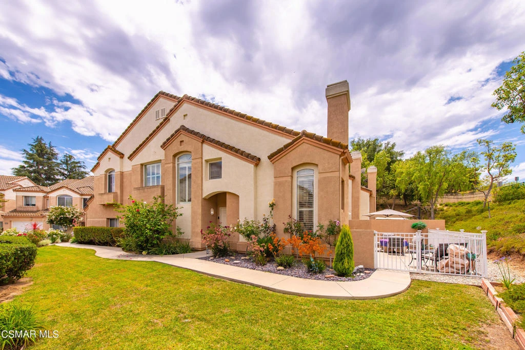 Welcome to Wood Ranch's gated community of Cantrice Court! This inviting end-unit townhome offers 3 bedrooms, 2.5 bathrooms, and 1,763 sq. ft. of comfortable living space, perfect for those seeking a welcoming home in a great neighborhood. Upon entering, you'll find a tile entry leading to a cozy step-down living room with wood flooring, vaulted ceilings, and a fireplace. The floor-to-ceiling windows let in plenty of natural light, creating a bright and cheerful atmosphere. The dining area, adjacent to the living room, has a sliding door that opens to the expansive back patio with tile and concrete, overlooking the greenbelt--a perfect spot for relaxing and enjoying the outdoors. The kitchen features light oak cabinets, Corian countertops, a pantry, recessed lighting, wood flooring, and a breakfast nook. It's a practical space that's open to the family room, which has wood flooring and a charming overlook from the second floor, making it great for family gatherings and everyday living. Upstairs, the wooden staircase leads to a landing that provides a nice view of the living room below. The primary bedroom has vaulted ceilings, a walk-in closet, and an en-suite bathroom with a marble soaking tub, walk-in shower with a bench, and a dual-sink vanity. There are two additional bedrooms upstairs, one of which is set up as an office. Both rooms have volume ceilings, large windows, and wall closets. The hall bathroom is equipped with tile flooring, a dual-sink vanity, and a tub/shower combo with a glass enclosure. The laundry closet with storage cabinets is conveniently located on the upper floor as well. Other features of this lovely townhome include dual-pane windows, 3-inch wood shutters on all windows, and a 2-car direct access garage with storage area. The community offers an association pool and spa, guest parking, and is conveniently located near hiking trails, Sycamore Canyon Park, the Wood Ranch Golf Course, and the Ronald Reagan Presidential Library. With its original owners and beautifully maintained landscaping featuring lush plants and flowers at the entry, this townhome is a wonderful opportunity to enjoy comfortable living in a privately gated community. Don't miss out on making this charming property your new home!