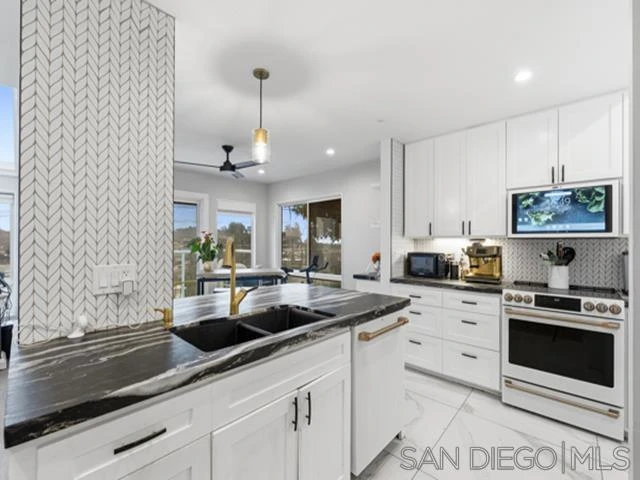 Panoramic Ocean and Del Mar Racetrack views from this recently remodeled beautiful townhome with high ceilings, recessed lighting, neutral decor. Cafe appliances, double sink with Zebra marble counter surfaces, light and airy. Tiled baths, built-in kitchen monitor, baths redone. Elegance in every respect. Pool, Spa and Beach, Bike and Hiking trails in close proximity as well as a number of fabulous restaurants.