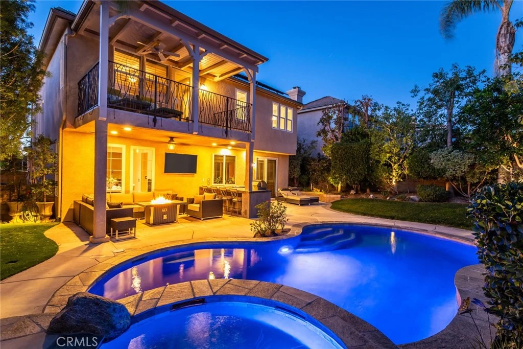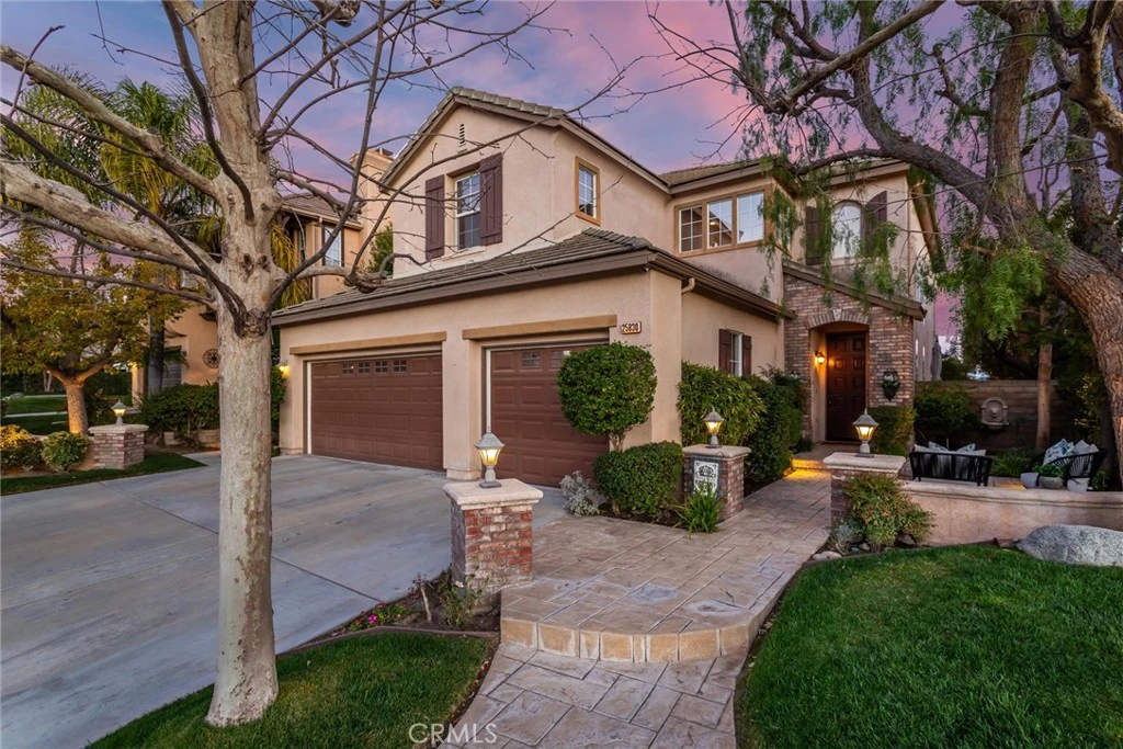 Welcome to this stunning Executive Pool home nestled in the prestigious upper Stevenson Ranch neighborhood, located on a beautiful elevated cul-de-sac with views of the surrounding landscape. From the moment you arrive, the home’s striking curb appeal draws you in, featuring lush landscaping, an expansive driveway, and a beautiful front lawn with a welcoming porch. Encompassing nearly 3,000 sq. ft, this home offers 4 spacious bedrooms (1 down,) dedicated office (possible 5th bedroom,) 3 bathrooms, elegant formal living and dining rooms, family room, laundry room, and an additional office nook. Step inside to find dramatic vaulted ceilings, inviting paint selections, rich wood flooring, and an abundance of windows that flood the space with tons of light. The upgraded kitchen features an abundance of cabinetry, granite countertops with seamless backsplash, stainless steel appliances, large center island, charming breakfast nook, walk-in pantry, and a built-in buffet with coordinating granite surfaces. The adjacent dining area showcases views of the backyard and neighborhood. The expansive family room offers the perfect space for gatherings, featuring a fireplace and seamless access to your entertainer’s backyard. Upstairs, the generously sized primary suite is a luxurious retreat, with views of the surrounding mountains and dual walk-in closets with custom built-ins. The spa-like ensuite bath offers dual vanities with quartz counters, upgraded cabinetry, an oversized soaking tub, and a separate walk-in shower with custom tile work. The oversized covered terrace is a romantic get away, enjoy the incredible views of the Santa Clarita Valley and surrounding mountains. The Secondary bedrooms are well-sized, each with ample closet space. The shared hall bath includes dual sinks with granite counters and a private shower room. Step outside to your own resort-style backyard on an impressive VIEW lot, complete with a newer custom patio featuring surround sound, recessed lighting and a ceiling fan. The outdoor kitchen is incredible with Coyote BBQ grill, smoker, built in refrigerator, and a beverage cooler! You will love the resort style pool and spa accented with gorgeous flagstone, and a large side yard ideal for a pet run or additional play area. Additional features include: a solar energy system, upstairs laundry, custom closets organizers, and a 3 car garage. Located near Richard Rioux Park, award-winning schools, shopping, restaurants and easy freeway access.