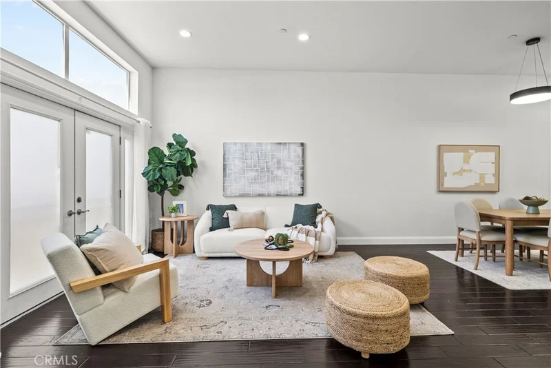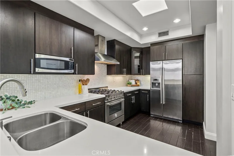 Discover this stunning two-story Penthouse with 2-bedrooms, 2.5-baths in the highly sought-after Studio Villas West, a mid-century-inspired building in Studio City. Located on the top floor, this unit boasts an open, sunlit living and dining area with recessed ceilings, dark hardwood floors, a gas fireplace, and french doors. The chefs kitchen features stainless steel appliances, a Bertazzoni range, quartz countertops, and ample storage. The primary suite impresses with a luxurious en-suite bath complete with a dual vanity, soaking tub and separate shower. The unit also features an additional bedroom with its own en-suite bath, a hall bath, and in-unit stacking front-loading laundry. Additional highlights include recessed lighting throughout, two parking spaces, a fitness center, courtyard with fountains, controlled access and common area security. Studio Villas West, built in 2009, is steps from CBS Radford Studios, the Studio City Farmers Market, and the vibrant shops and restaurants on Ventura Blvd. Its prime location offers easy access to Carpenter Community Charter School, parks, trails, and local amenities