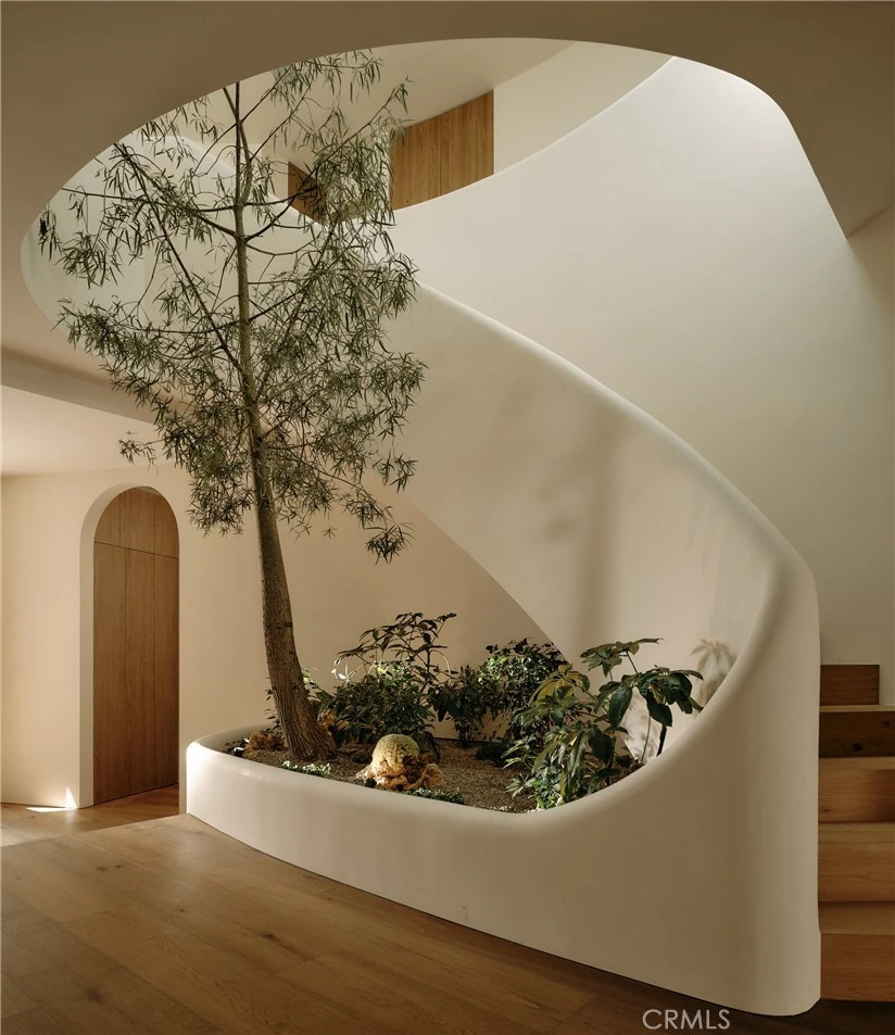 A study in light, air, and quiet refinement, Aether House is designed to evoke the calm of a Mediterranean escape—where architecture and nature exist in perfect balance. From the moment you enter, the home opens effortlessly, with soft natural light pouring through expansive openings and illuminating a palette of warm woods and natural stone. Defined by a language of architectural curves, the home unfolds through soft transitions and sculptural lines that create a sense of flow, movement, and harmony throughout every space. At the heart of the home, a sculptural staircase rises as both a functional element and a work of art—wrapping around a living tree that reaches toward a skylight above. This central moment brings nature indoors in its purest form, creating a constantly evolving focal point of light, shadow, and life that anchors the entire home. The layout flows with ease—open yet intimate—creating moments of connection throughout while still offering privacy where it matters most. Living spaces extend seamlessly outdoors to sunlit terraces, a resort-style pool, and curated landscaping that further blurs the line between interior and exterior living. The kitchen is both sculptural and functional—crafted with natural materials and refined detailing, designed as a central gathering point that feels as effortless as it is striking. Upstairs, the primary suite serves as a private retreat suspended in light, with serene views, soft textures, and a spa-like bath that reinforces the home’s calming presence. Four additional ensuite bedrooms are thoughtfully positioned throughout the home, complemented by a dedicated bonus media/theatre room—offering a flexible space for entertainment, screening, or private retreat beyond the home’s five-bedroom, five-and-a-half-bath layout. Positioned in one of Studio City’s most coveted pockets south of Ventura Boulevard, just moments from Harvard-Westlake School, Erewhon Market, and the lifestyle and dining of Sportsmen’s Lodge, this is a location defined by convenience, prestige, and everyday luxury—while still offering a sense of privacy and retreat.