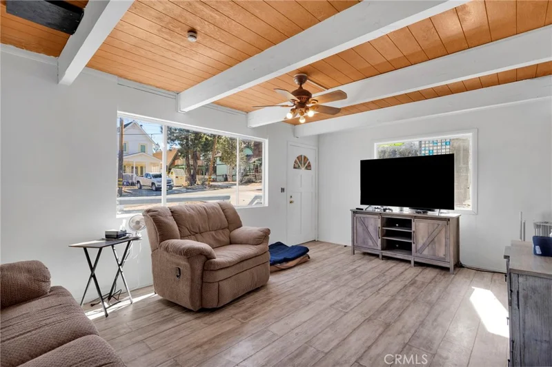 The perfect cabin for your vacation home or full time residence! Fresh interrior and exterrior paint give the home a fresh and clean feel, waiting for you to move in and make it your own! The lot size has been well utilized, with parking spaces in the front the backyard is fully fenced with cement work, retaining wall, grass area and a storage shed. Inside the home you will appreciate the designated living areas with beautiful beamed ceilings throughout the lower level. Plus indoor laundry room and half bath inside. Upstairs are both bedrooms and shared full bathroom.