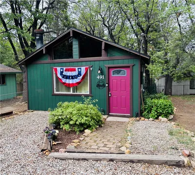 Cozy, turnkey mountain retreat in Sugarloaf, just 20 minutes from Big Bear Village. This 1-bedroom, 1-bath home is set behind a gated entry with a spacious driveway, fenced yard, and two mature trees that provide shade and privacy. A storage shed in the back offers extra space for tools or hobbies. This property holds a valid short-term rental permit, making it an ideal investment opportunity as well as a perfect weekend retreat. Inside, the living room features a bay window, cathedral ceiling, and a wood-burning stove for a warm, inviting feel. The efficient kitchen includes oak cabinets and additional storage for pantry use or small appliances. The bedroom is tucked away at the rear with an ensuite bath and a stacked washer and dryer.