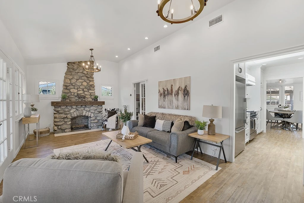 Rare equestrian zoned single family residence in Sun Valley, California offering 2 bedrooms and 1.5 bathrooms of fully renovated living space, plus turn key horse stalls, covered runs, a fenced rear paddock, and a utility shed on a flat, usable lot. This stone-accented ranch-style home has been renovated with expensive high-end quality farmhouse finishes throughout. Soaring vaulted ceilings with exposed dark wood beams, hardwood floors, and a dramatic floor-to-ceiling stacked stone fireplace with a reclaimed wood mantle anchor the open-concept living area. The remodeled chef's kitchen features white shaker cabinetry, white quartz countertops, a professional stainless steel range with a custom hood and pot filler, an apron-front farmhouse sink with matte black fixtures, shiplap accent walls, and open floating shelves. The spa-caliber full bathroom includes a freestanding soaking tub, ceiling-mounted rain shower, subway tile walls, mosaic hex tile flooring, a wood vanity with a marble countertop, and antique bronze hardware — while a separately finished powder room delivers its own farmhouse charm. A covered brick patio with an exposed beam ceiling and skylight panel creates a seamless indoor-outdoor living experience. The gated carport, arched stone colonnade, and manicured front lawn deliver serious curb appeal. Minutes from the 5 and 170 Freeways, Burbank, and the broader San Fernando Valley, this is a turnkey equestrian property unlike anything else on the market.