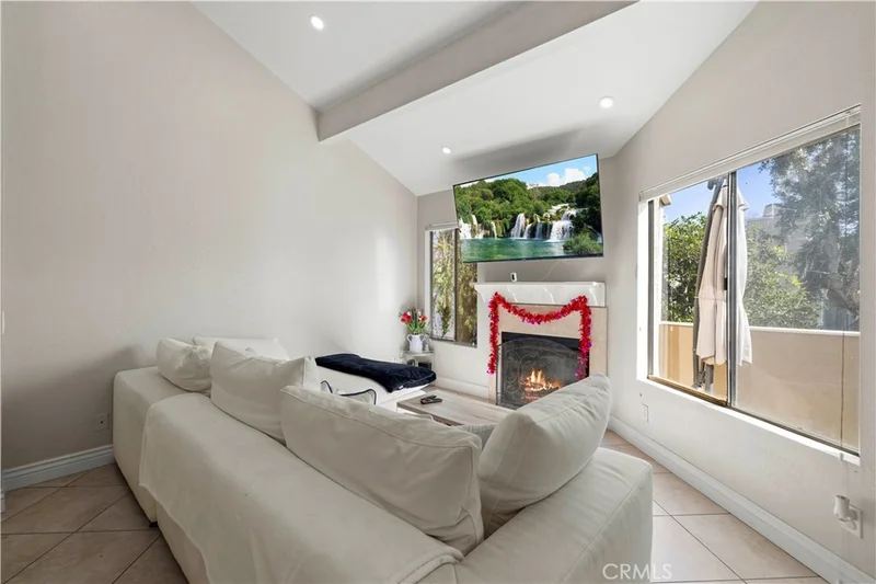 This beautiful upper-level condo is located in one of Tarzana’s most sought-after gated communities, Tarzana Woods, surrounded by lush landscaping, colorful flower beds, and mature shade trees that create exceptional curb appeal. Step inside to a bright and open floor plan offering approximately 866 square feet of comfortable living space. The spacious living room is filled with natural light and features soaring beamed ceilings, recessed lighting, elegant tiled electric fireplace with mantel, and 18"X18" diagonally laid porcelain tile flooring throughout the main living areas. The open kitchen is light and welcoming, showcasing white cabinetry that extends to the ceiling, laminate countertops, a dual-basin sink, stainless steel appliances—including an electric range, built-in microwave, and dishwasher—a convenient pantry, and easy-care tile floors. Adjacent to the kitchen, the dining area features a lighted ceiling fan, mirrored walls, and direct access to the private balcony, making it ideal for both everyday meals and entertaining. This home offers two generously sized bedrooms and one well-appointed bathroom. The primary bedroom includes a large picture window with honeycomb shades, dual closets—with mirrored wardrobe doors—and plush wall-to-wall carpeting. The second bedroom also features a large window, honeycomb shades, ample closet space with mirrored doors, and wall-to-wall carpeting. The bathroom is tastefully designed with a white vanity, integrated basin, large dressing mirror, designer lighting, tub/shower combination, and porcelain tile flooring. The hallway provides additional storage with a coat closet and abundant linen cabinets. A convenient indoor laundry area with extra storage adds to the home’s functionality. Enjoy quiet mornings or evening dining on your private balcony, perfect for relaxing outdoors. Additional highlights include a NEWER HVAC system, a sparkling community pool and spa, and a gated two-car tandem covered carport with built-in storage, plus ample guest parking. Ideally located near shopping, dining, excellent schools, the 101 Freeway, and public transportation, this home offers comfort, convenience, and resort-style living in a prime Tarzana location.