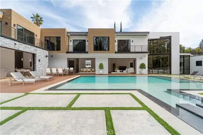 Experience exceptional living in this newly constructed modern farmhouse, located on a sprawling 1.6-acre flag lot in Tarzana. This extraordinary estate, designed for grand living and entertaining, is accessed through two private gates and a 400-foot driveway, leading you to a home that combines elegant design with practical features. The home epitomizes refined living and timeless luxury, offering 5 spacious bedrooms and abundant room for comfort and convenience. The expansive open-concept layout is perfect for both relaxation and entertaining, with seamless transitions between indoor and outdoor spaces. The custom chef's kitchen boasts state-of-the-art Miele appliances, a built-in coffee maker, wine cellar, butler's pantry, large pantry, and a massive center island with bar seating. The kitchen opens up to the large family room featuring a fireplace, aquarium, custom shelving and views of the meticulously landscaped grounds, creating a welcoming atmosphere for everyday meals and grand gatherings. A formal dining room, living room, lounge area, and an additional eating area complete the downstairs.The second level offers an additional family room, oversized ensuite bedrooms, and a laundry room. The luxurious primary retreat features beamed ceilings, a fireplace, custom shelves, an expansive balcony that overlooks the backyard, dual large closets with custom cabinetry, dual vanities, a soaking tub. and a large steam shower. The estate is designed with entertainment in mind, featuring a full-size tennis and basketball court, a resort-style pool with a water slide, waterfalls, a baja shelf, and a grotto. There's also a versatile pavilion with a bath and wet bar for hosting events, and a covered tennis pavilion. Enjoy cinematic experiences in the state-of-the-art home theater, or unwind in the private gym with direct access to the tennis and basketball court.Additional features include a main floor ensuite bedroom, a detached guest house for visitors or extended family, a three-car garage, a smart home and security system, and ample parking for multiple cars.