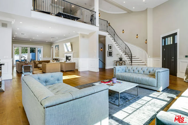 Elegant East Coast inspired gated residence in Tarzana, built in 2014, situated on an expansive 18,000+ sq ft lot. This designer-perfect home showcases quality craftsmanship throughout, featuring brushed white oak flooring, recessed lighting, Restoration Hardware wall sconces, and custom details. Offering 5 bedrooms (one currently used as an executive office/library) and 4.5 baths, the residence blends comfort with sophistication. The open chef's kitchen is designed for both daily living and entertaining, with quartz countertops, a large granite-topped island, top-of-the-line stainless steel appliances including a 6-burner range with pasta faucet, and a butler's pantry. Adjacent to the kitchen is an oversized formal dining room and a spacious living room highlighted by a dramatic two-story ceiling. The main level also includes a guest bedroom suite. Upstairs, a versatile sitting area offers hillside views, along with a convenient laundry room with sink. Two additional en-suite bedrooms complement the elegant primary suite, which boasts dual walk-in closets and a spa-inspired bath with a freestanding Midocean soaking tub, walk-in shower, dual vanities, and makeup counter. The large family room seamlessly connects to a resort-style backyard with a remote-controlled saltwater pool and spa, built-in BBQ island, fire pit, and expansive patio ideal for outdoor entertaining. Additional highlights include a two-car garage with space for a third vehicle, custom window coverings, dual-zoned HVAC, energy-efficient double-panned windows, LED lighting, and a security system with cameras. Conveniently located near The Village, Ventura Boulevard dining and shopping, Warner Center, local parks, and freeway access.